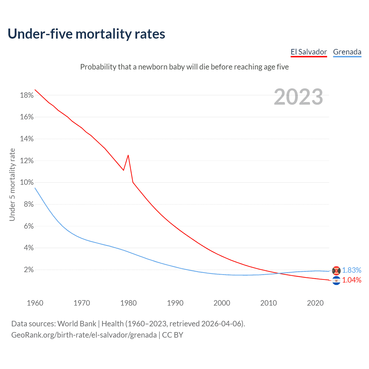 The chance that a newborn baby will die before reaching age five is 1.04% in El Salvador and 1.83% in Grenada. Above is a chart with historical data on under-five mortality rates.