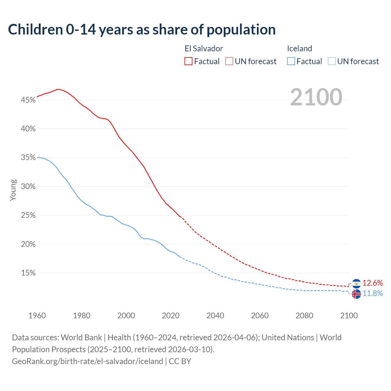 According to the latest available data on birth rates, the fertility rate in El Salvador was 1.78 children per woman in 2023, compared to 1.59 in Iceland in 2023. The replacement level is considered to be 2.1 children per woman.