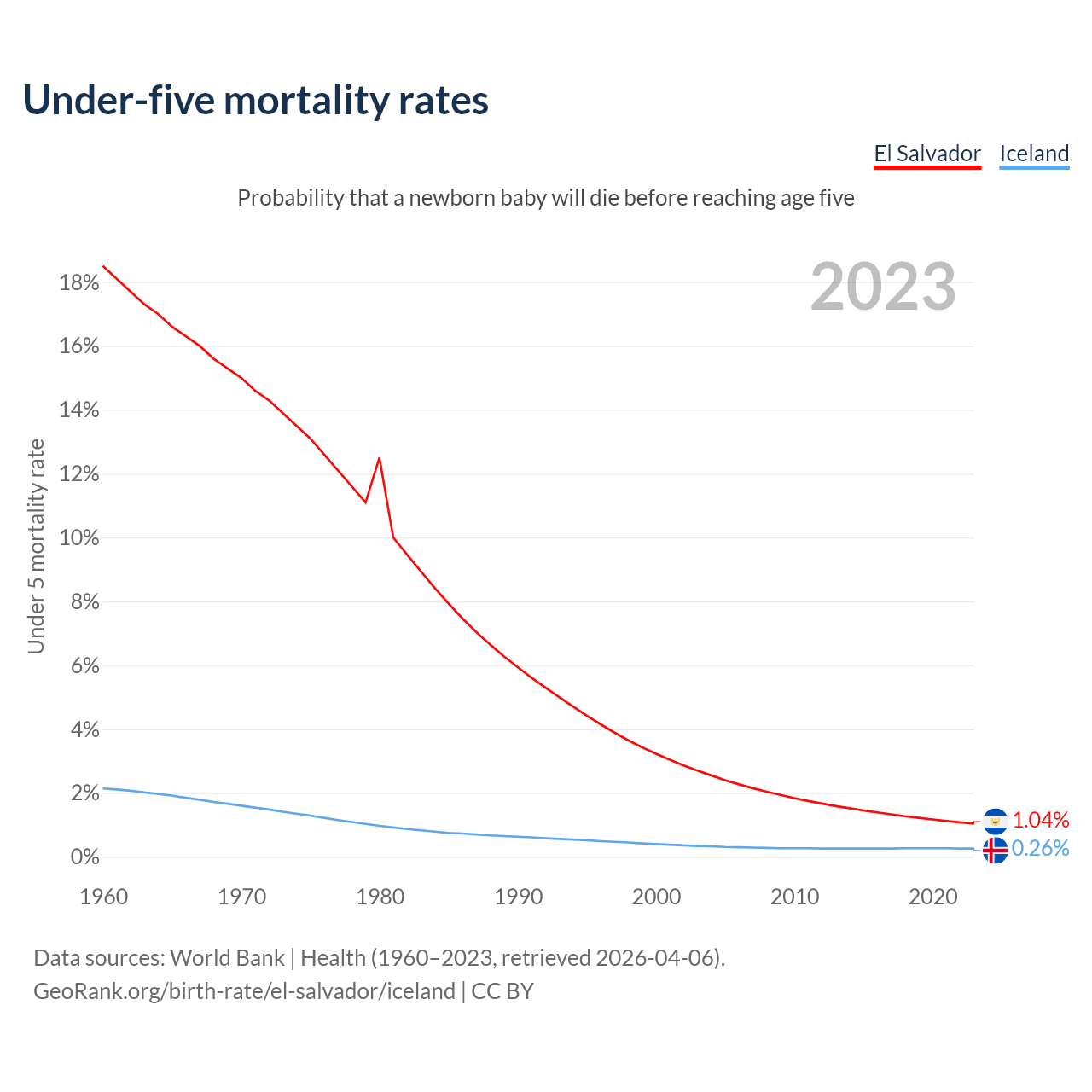 The chance that a newborn baby will die before reaching age five is 1.04% in El Salvador and 0.26% in Iceland. Above is a chart with historical data on under-five mortality rates.