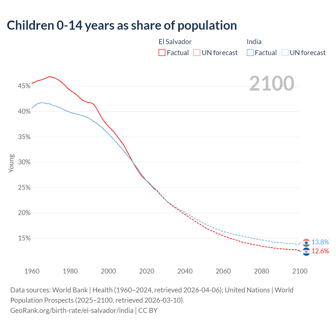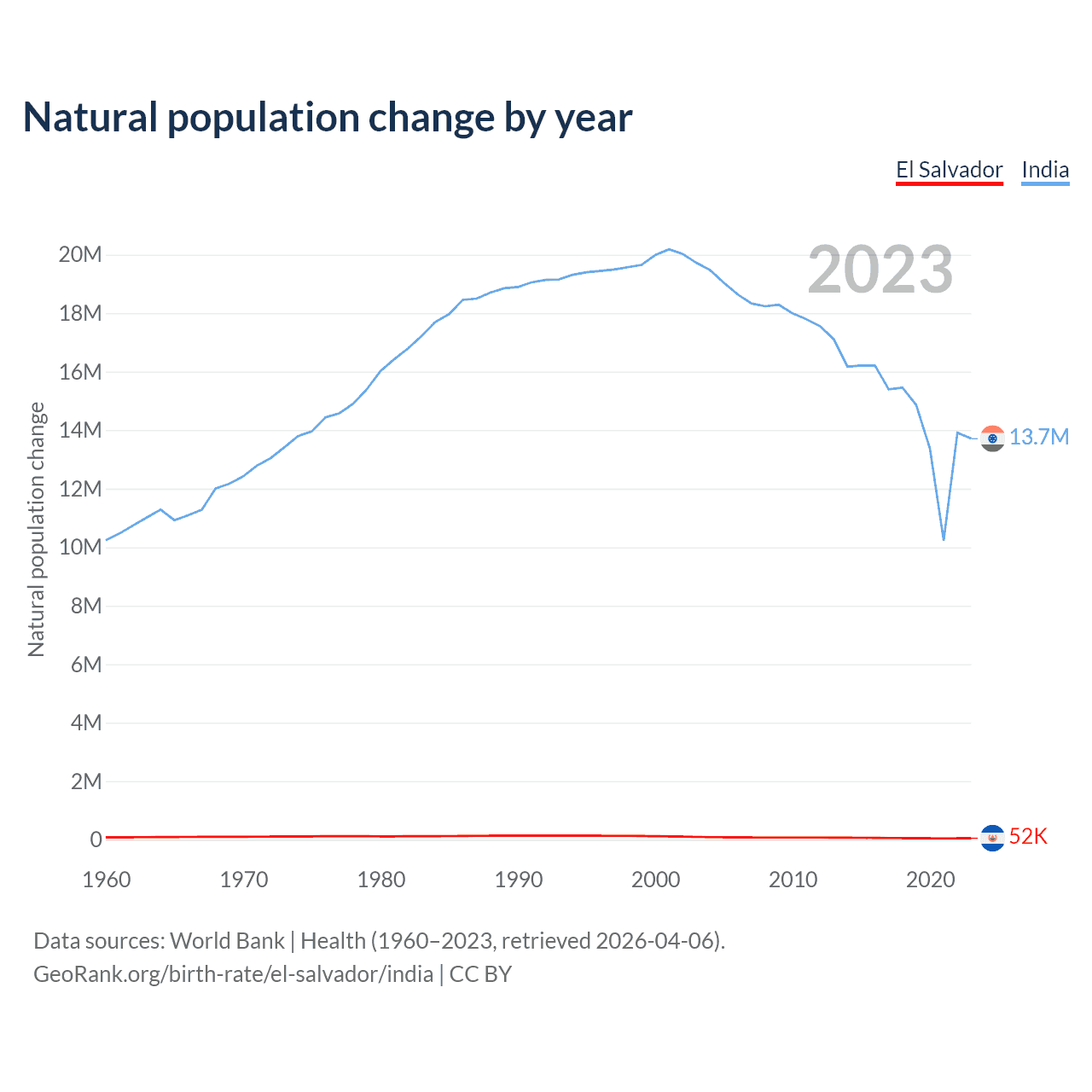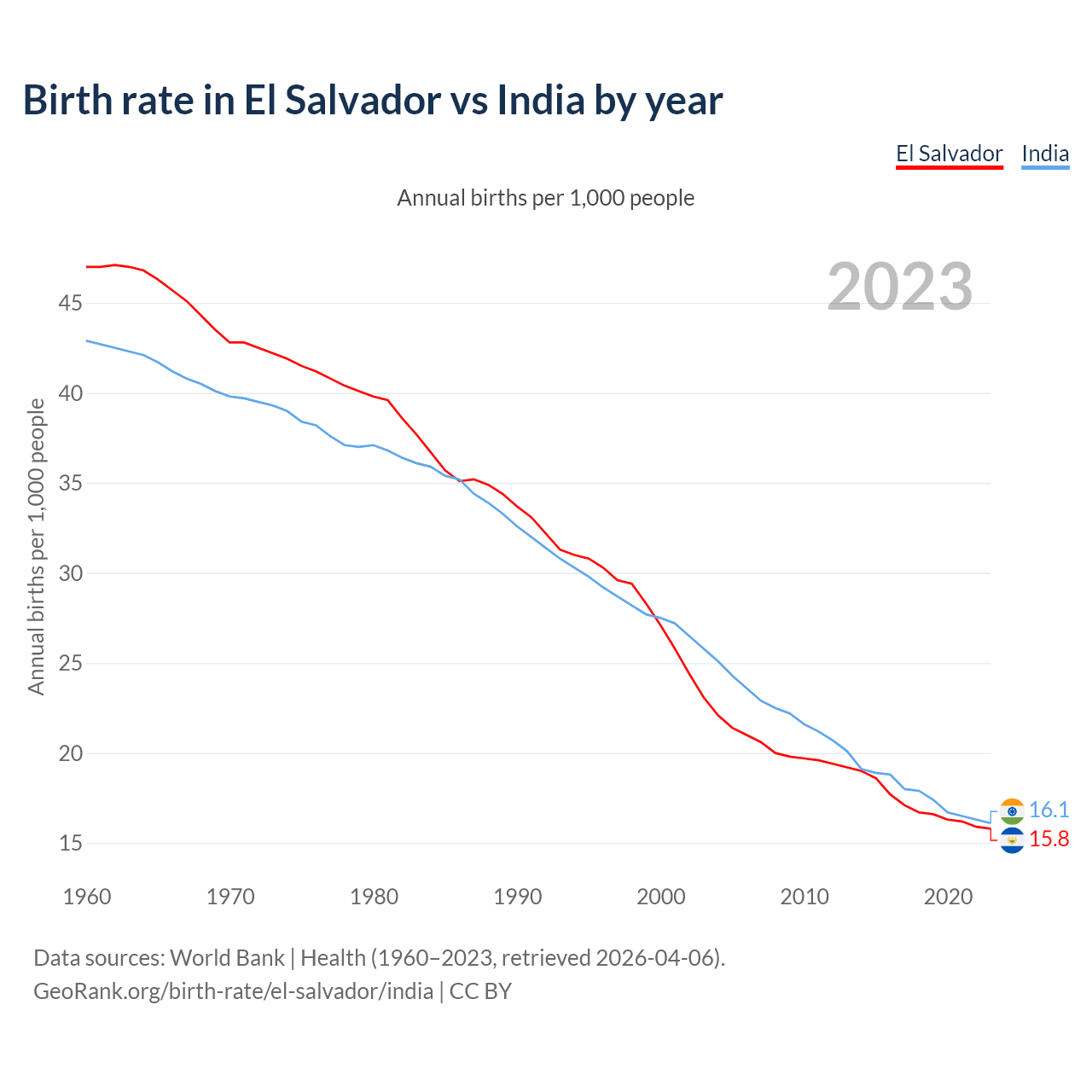 El Salvador has an annual birth rate of 15.8 births per 1,000 people, compared to 16.1 for India. The average number of children a woman is expected to have during her lifetime — the fertility rate, is 1.78 in El Salvador and 1.98 in India — 11.3% difference.