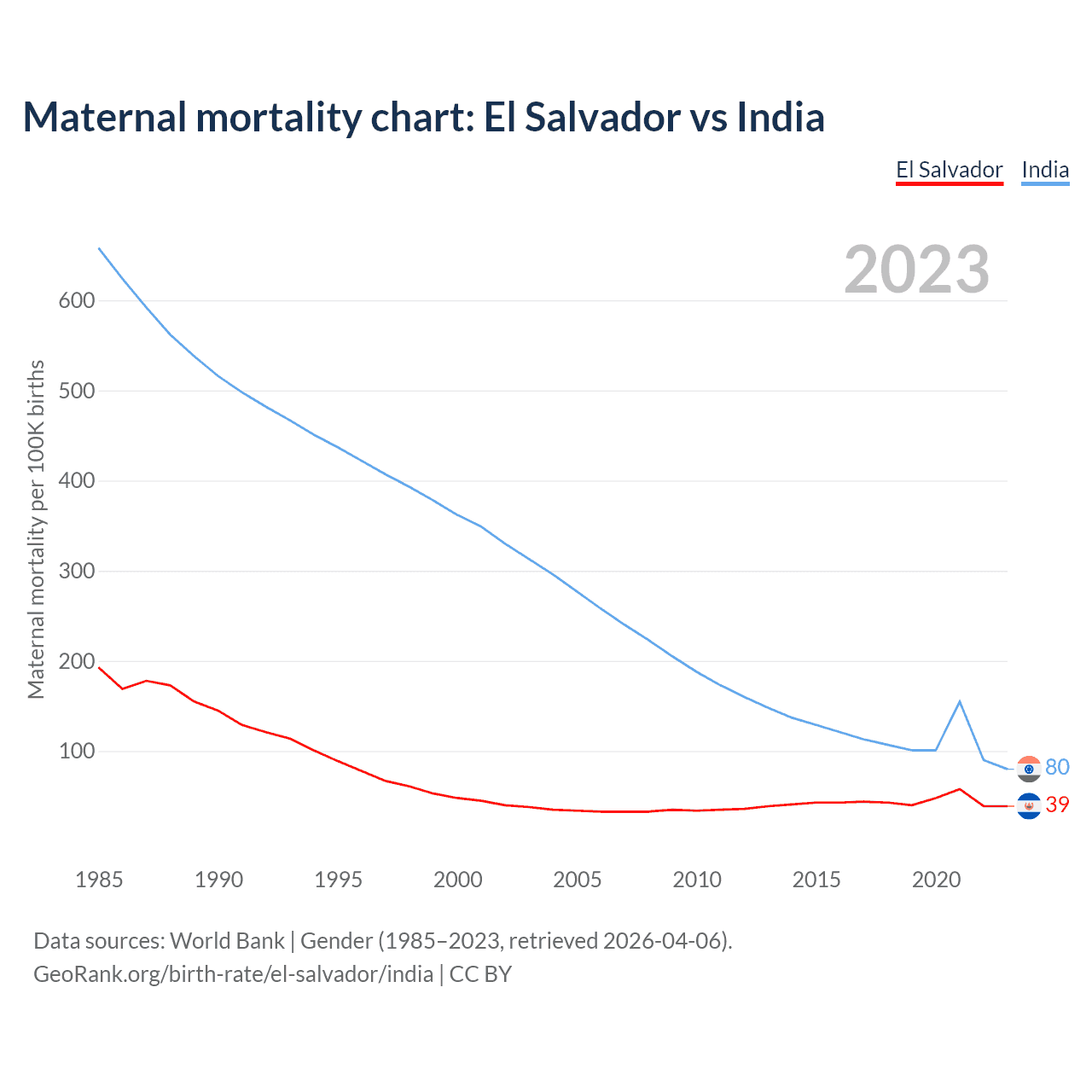 The maternal mortality rate, which is the probability of dying during childbirth or within 42 days of pregnancy termination, is 39 deaths per 100,000 live births in El Salvador, compared to 80 deaths in India.