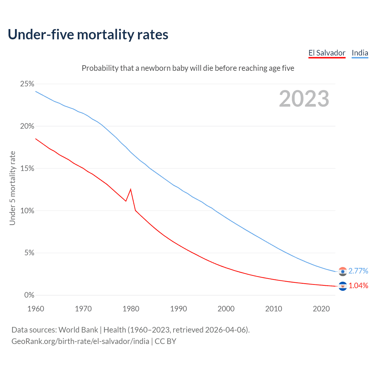 The chance that a newborn baby will die before reaching age five is 1.04% in El Salvador and 2.77% in India. Above is a chart with historical data on under-five mortality rates.