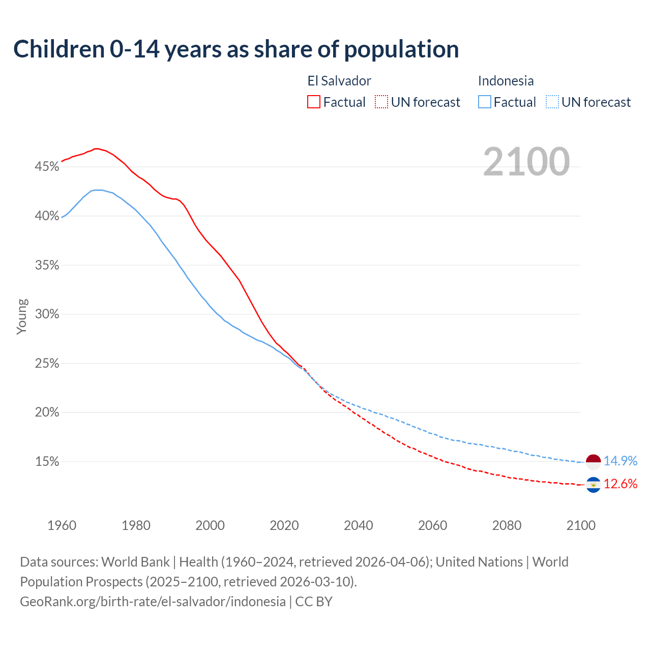 According to the latest available data on birth rates, the fertility rate in El Salvador was 1.78 children per woman in 2023, compared to 2.13 in Indonesia in 2023. The replacement level is considered to be 2.1 children per woman.