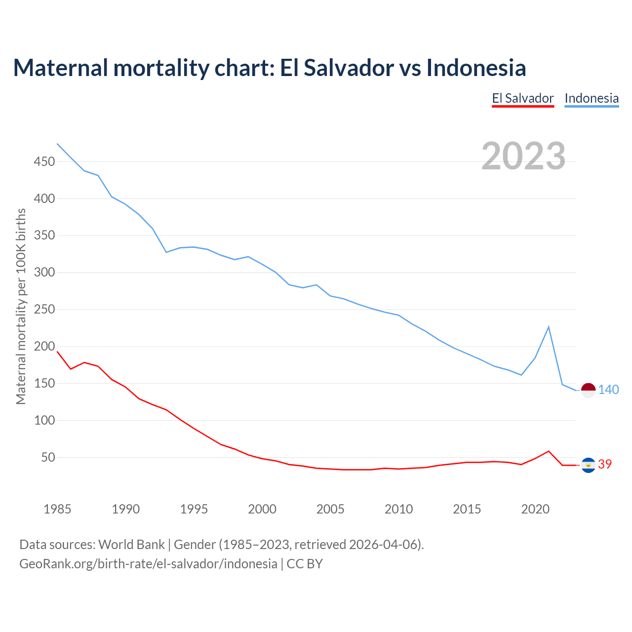 The maternal mortality rate, which is the probability of dying during childbirth or within 42 days of pregnancy termination, is 39 deaths per 100,000 live births in El Salvador, compared to 140 deaths in Indonesia.