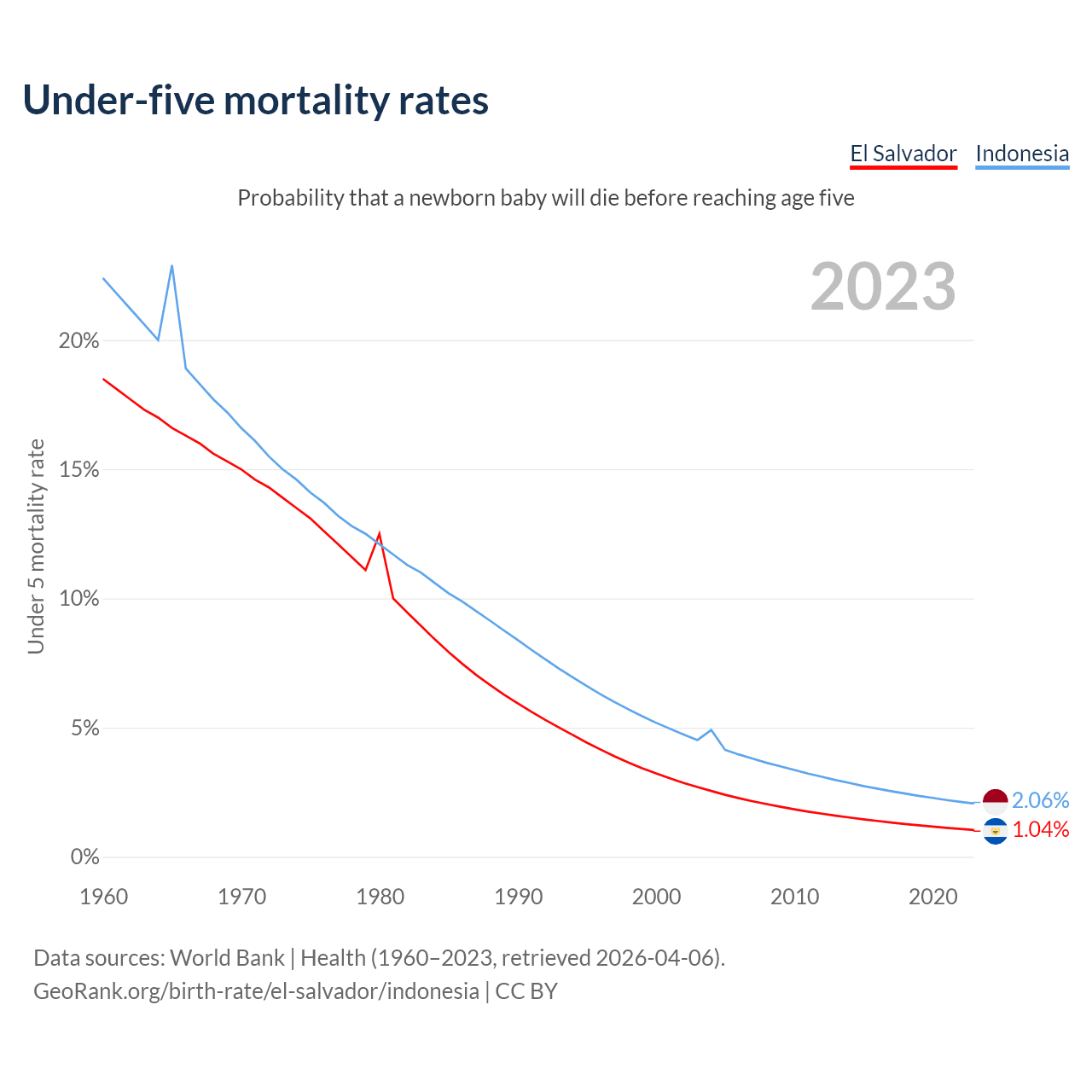 The chance that a newborn baby will die before reaching age five is 1.04% in El Salvador and 2.06% in Indonesia. Above is a chart with historical data on under-five mortality rates.