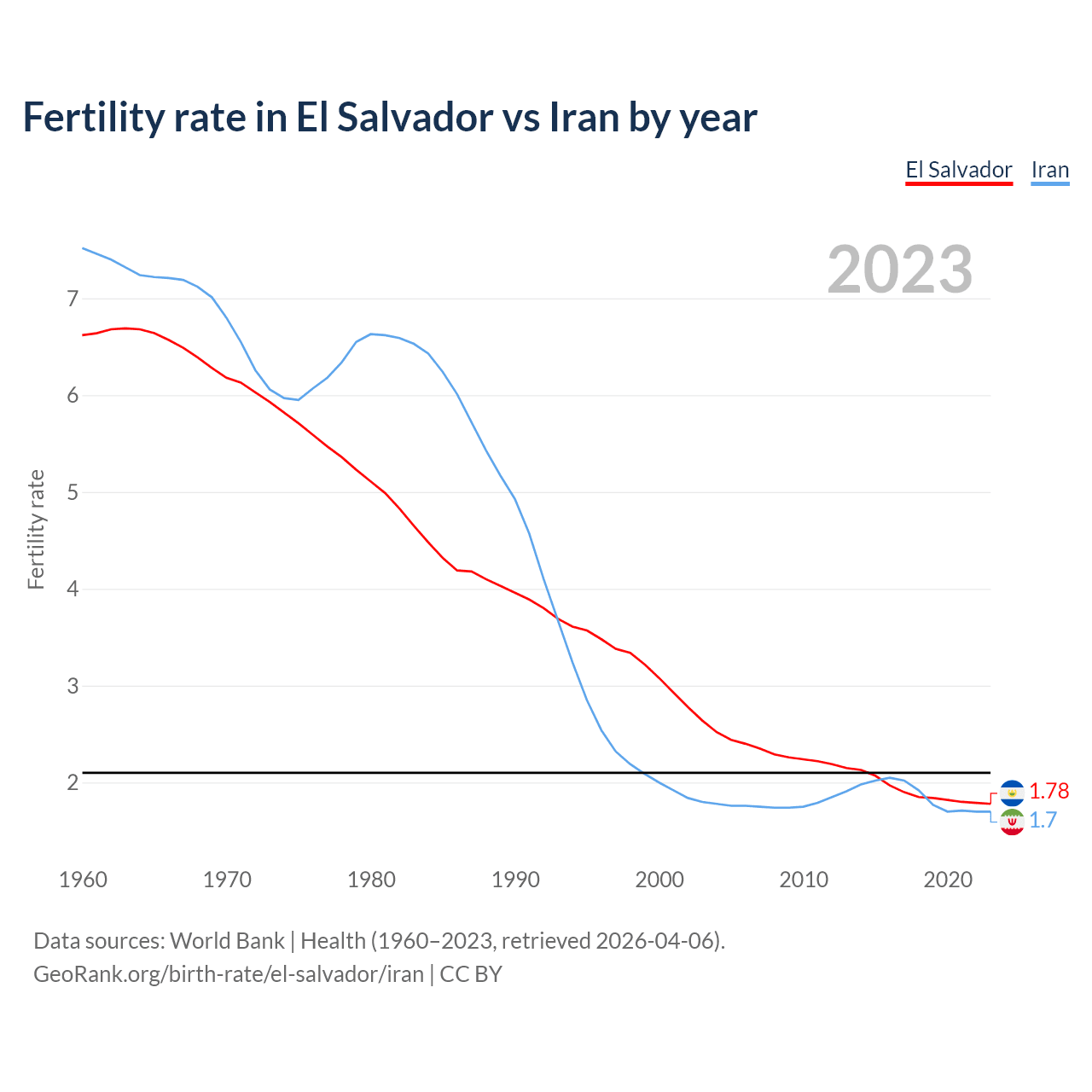 According to the latest available data on birth rates, the fertility rate in El Salvador was 1.78 children per woman in 2023, compared to 1.7 in Iran in 2023. The replacement level is considered to be 2.1 children per woman.