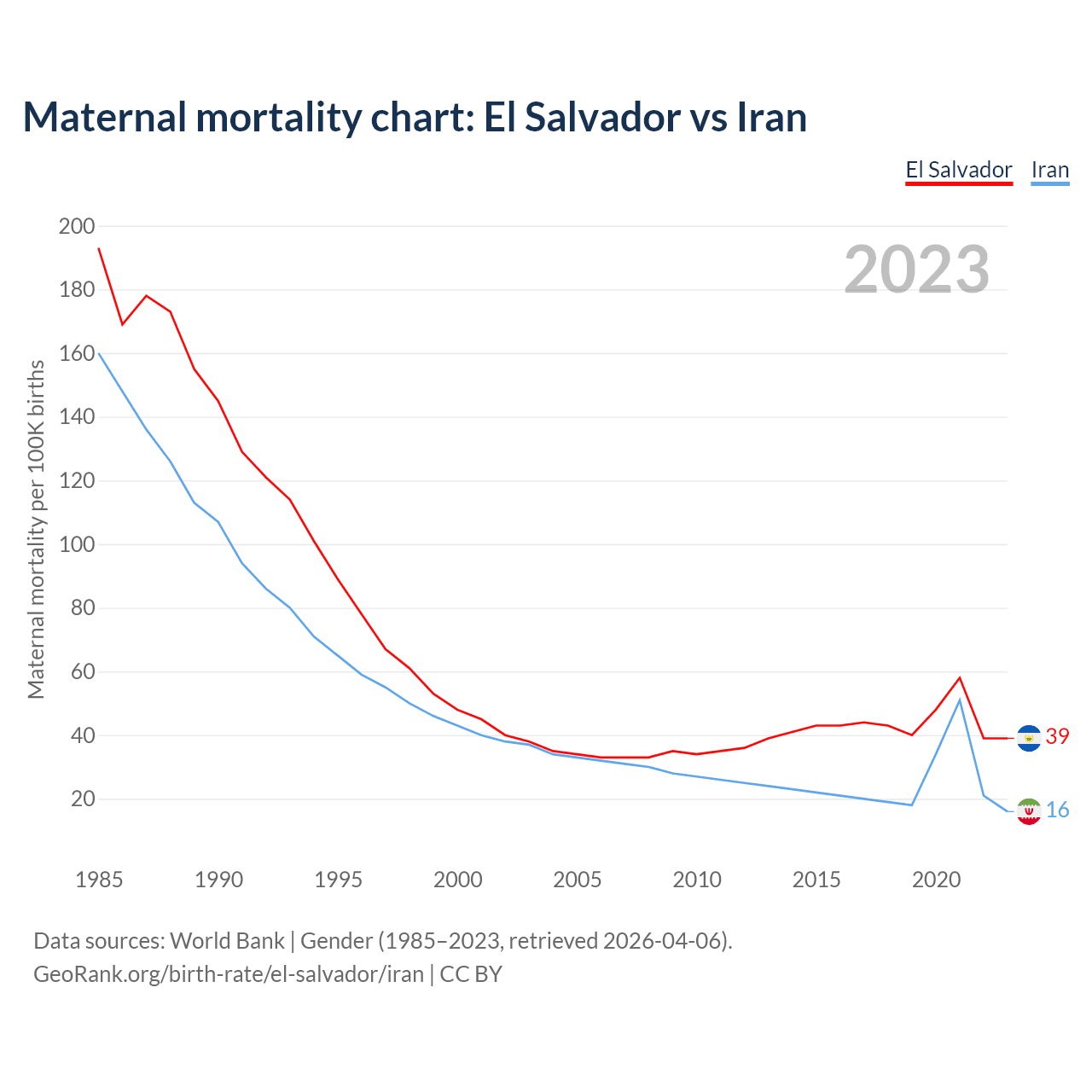 The maternal mortality rate, which is the probability of dying during childbirth or within 42 days of pregnancy termination, is 39 deaths per 100,000 live births in El Salvador, compared to 16 deaths in Iran.
