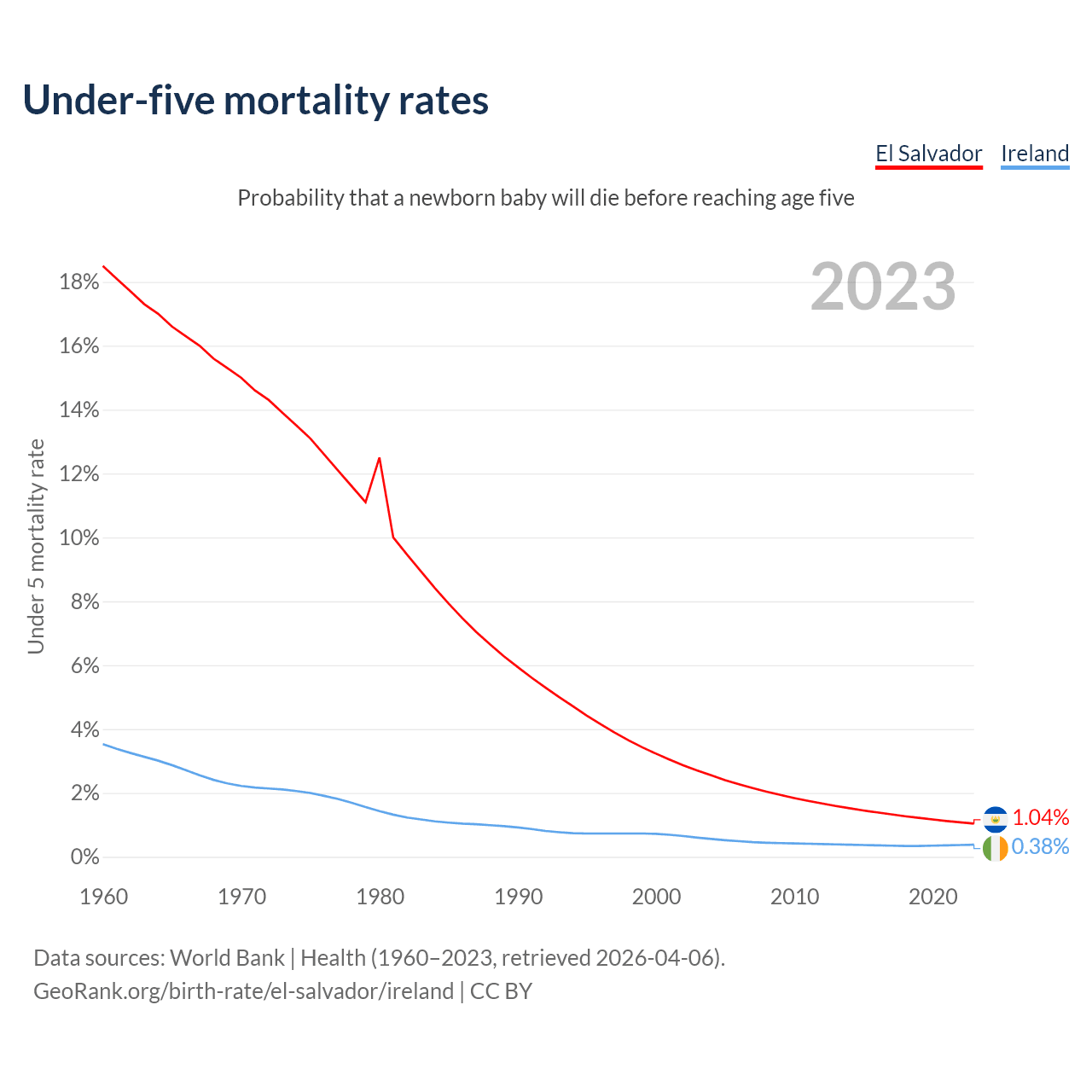 The chance that a newborn baby will die before reaching age five is 1.04% in El Salvador and 0.38% in Ireland. Above is a chart with historical data on under-five mortality rates.