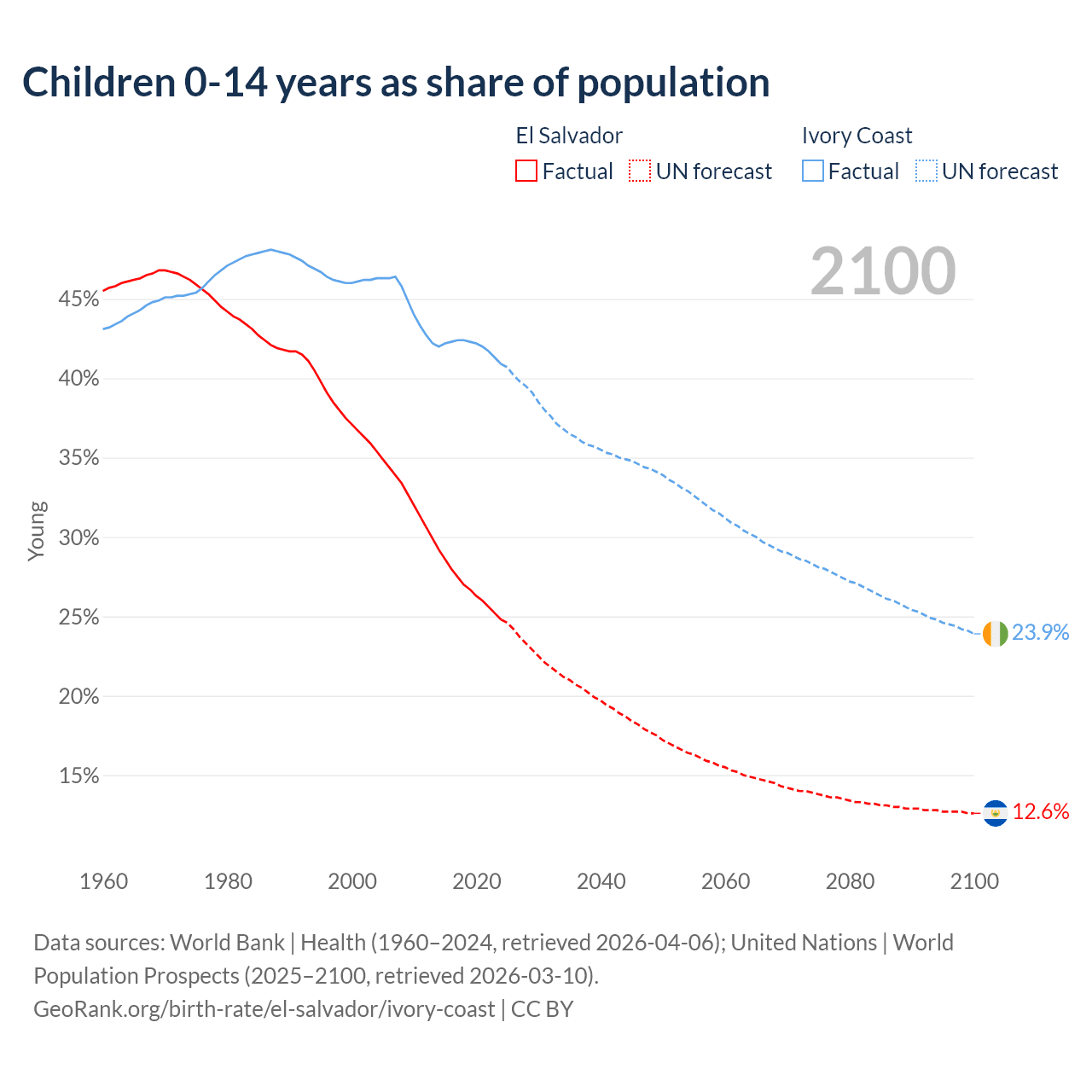 El Salvador has an annual birth rate of 15.8 births per 1,000 people, compared to 32 for Ivory Coast. The average number of children a woman is expected to have during her lifetime — the fertility rate, is 1.78 in El Salvador and 4.28 in Ivory Coast — 141.3% difference.