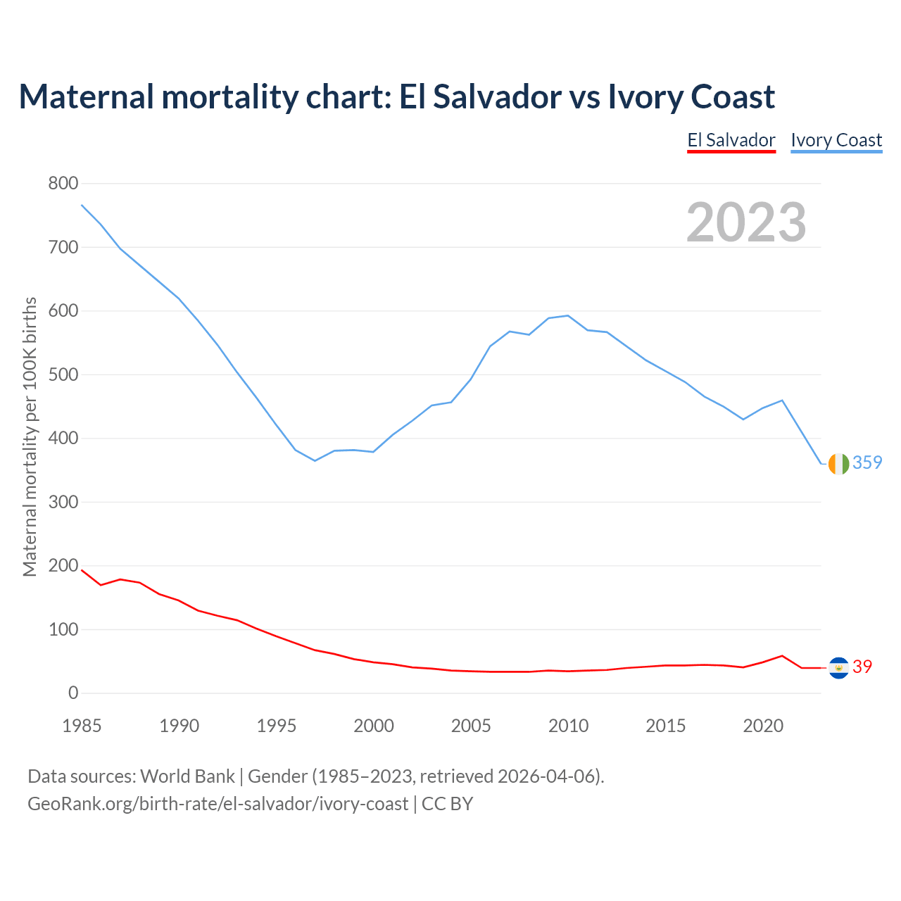 The maternal mortality rate, which is the probability of dying during childbirth or within 42 days of pregnancy termination, is 39 deaths per 100,000 live births in El Salvador, compared to 359 deaths in Ivory Coast.