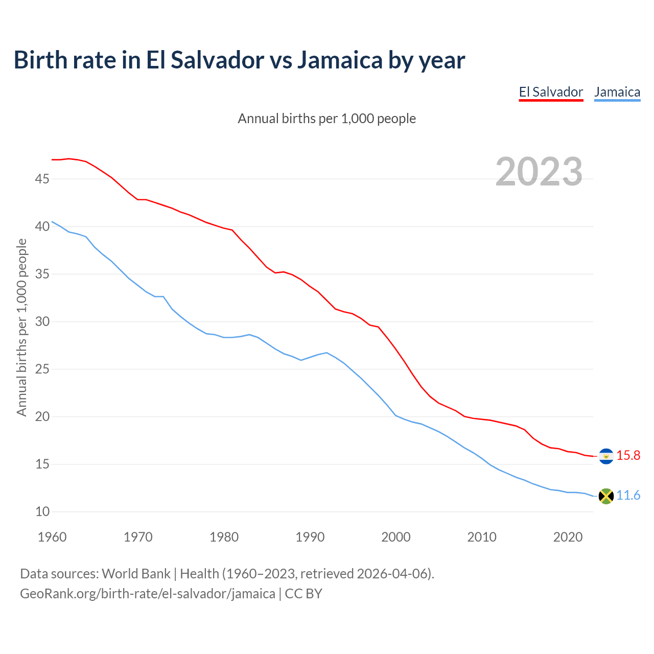 El Salvador has an annual birth rate of 15.8 births per 1,000 people, compared to 11.6 for Jamaica. The average number of children a woman is expected to have during her lifetime — the fertility rate, is 1.78 in El Salvador and 1.36 in Jamaica — 23.5% difference.