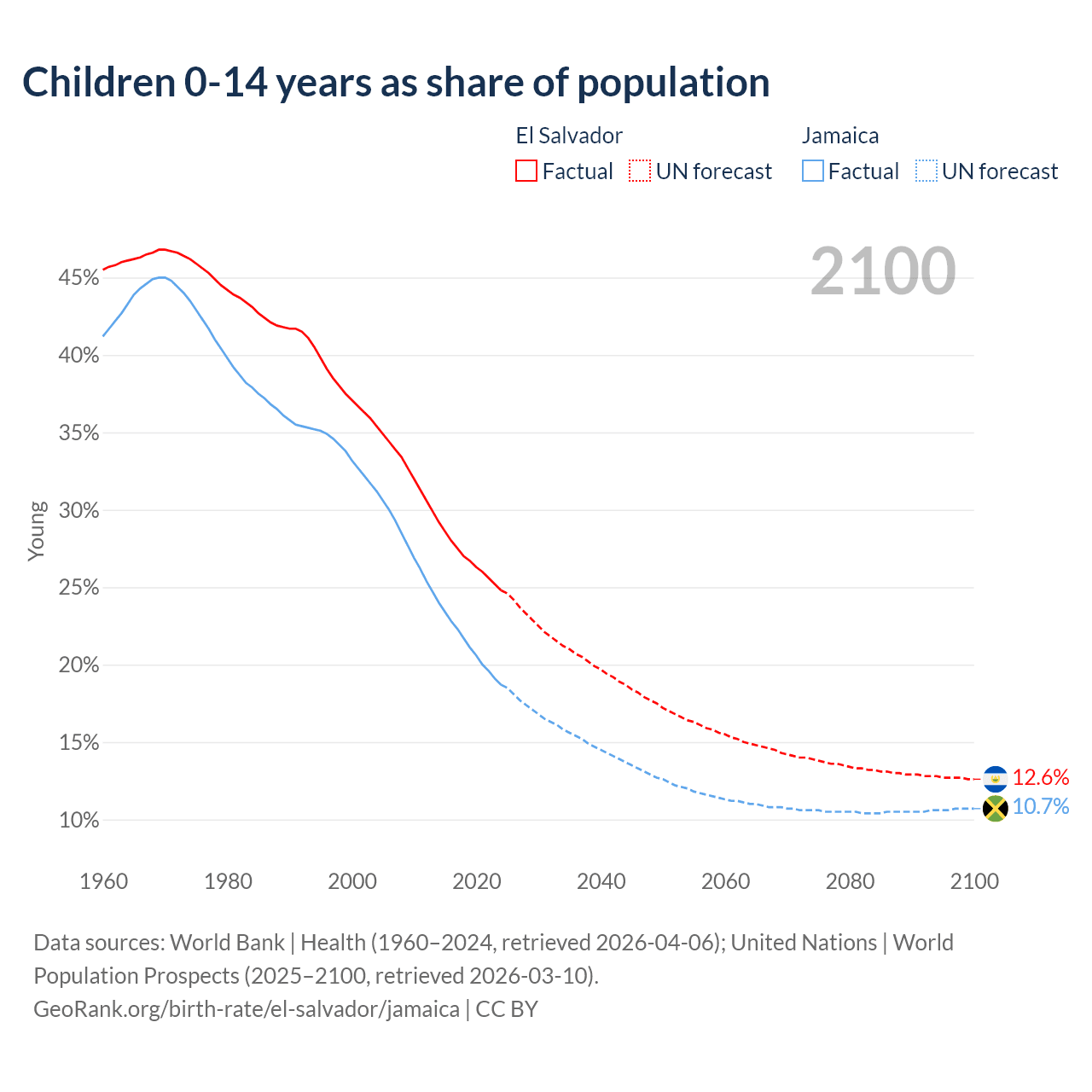 According to the latest available data on birth rates, the fertility rate in El Salvador was 1.78 children per woman in 2023, compared to 1.36 in Jamaica in 2023. The replacement level is considered to be 2.1 children per woman.