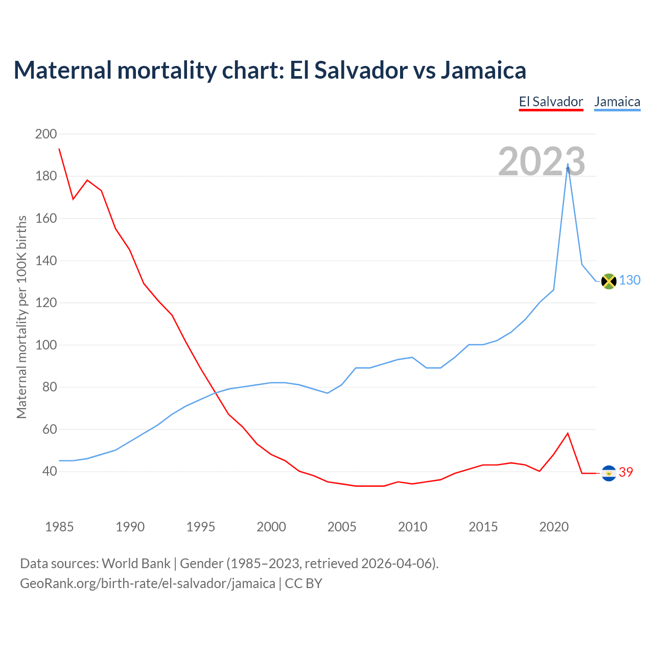 The maternal mortality rate, which is the probability of dying during childbirth or within 42 days of pregnancy termination, is 39 deaths per 100,000 live births in El Salvador, compared to 130 deaths in Jamaica.