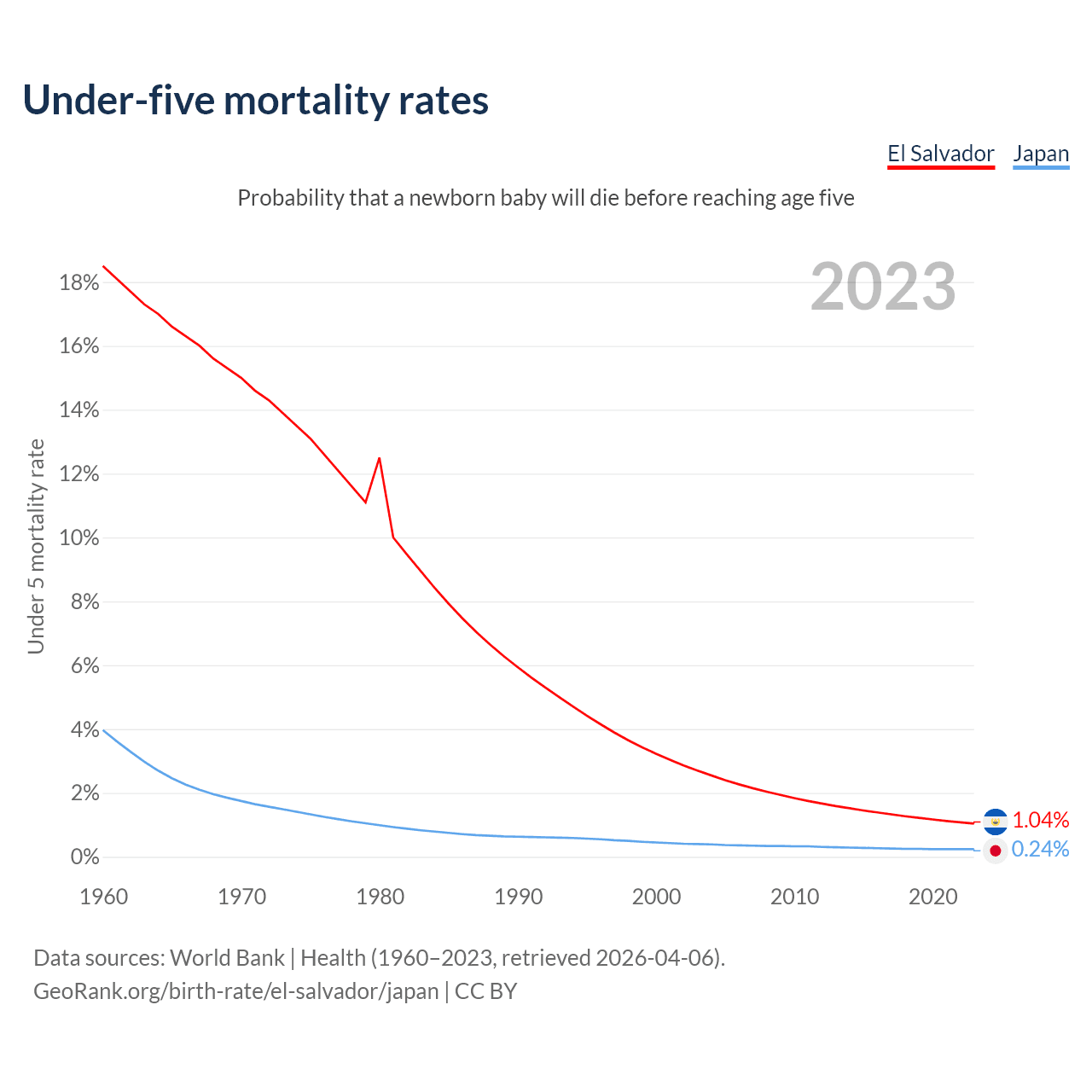 The chance that a newborn baby will die before reaching age five is 1.04% in El Salvador and 0.24% in Japan. Above is a chart with historical data on under-five mortality rates.