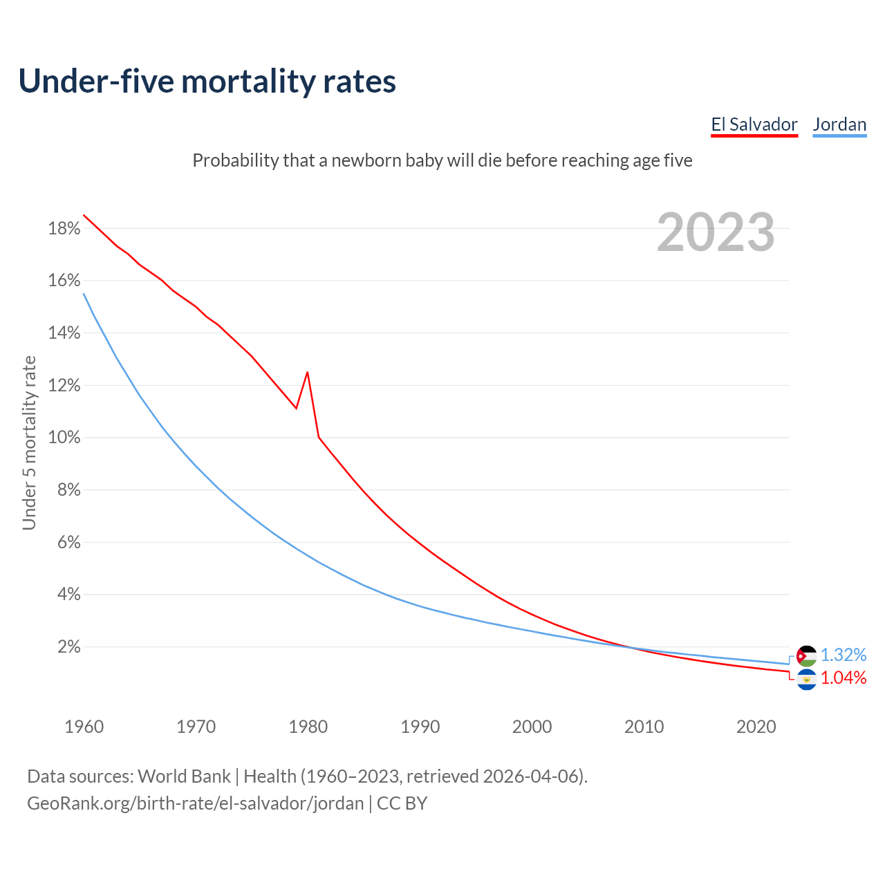 The chance that a newborn baby will die before reaching age five is 1.04% in El Salvador and 1.32% in Jordan. Above is a chart with historical data on under-five mortality rates.