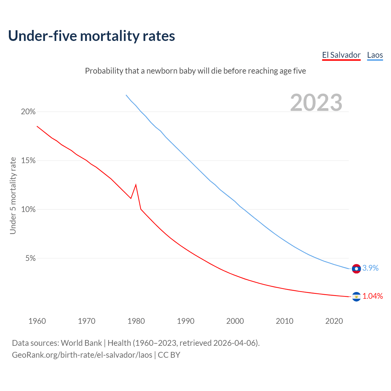 The chance that a newborn baby will die before reaching age five is 1.04% in El Salvador and 3.9% in Laos. Above is a chart with historical data on under-five mortality rates.
