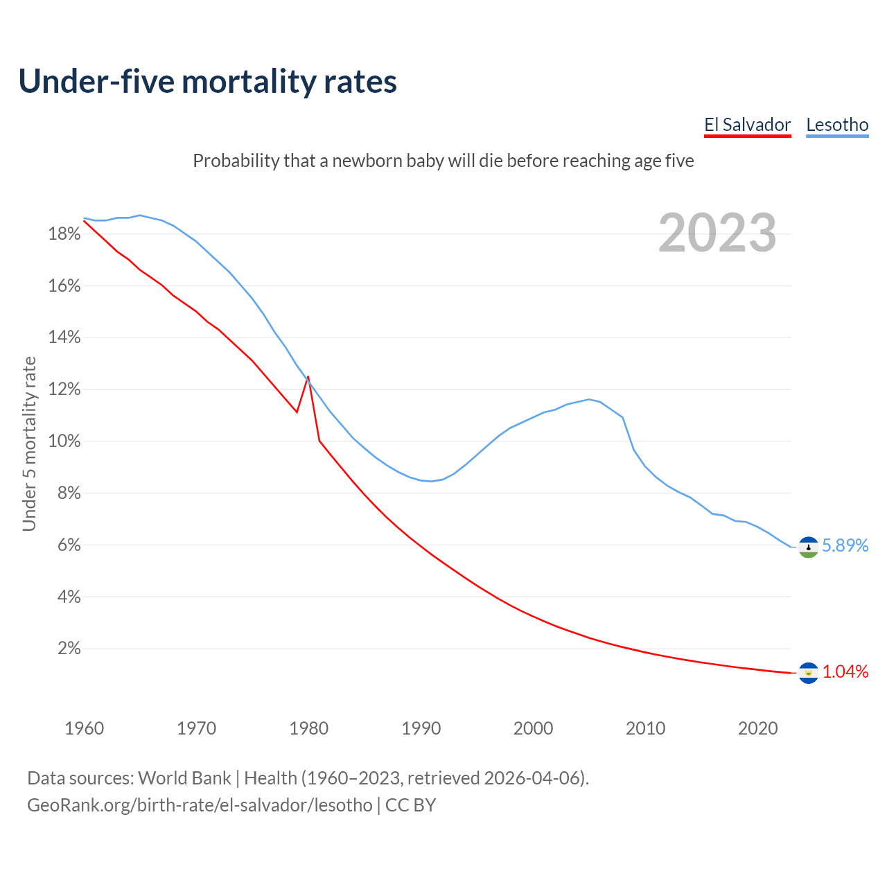 The chance that a newborn baby will die before reaching age five is 1.04% in El Salvador and 5.89% in Lesotho. Above is a chart with historical data on under-five mortality rates.