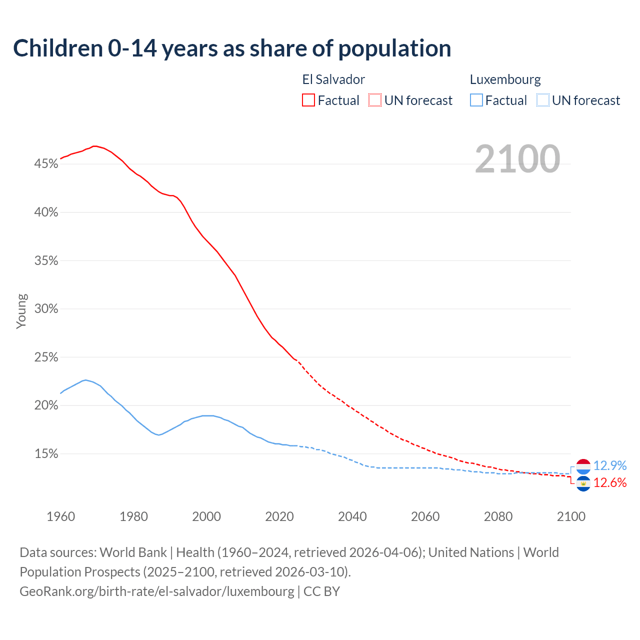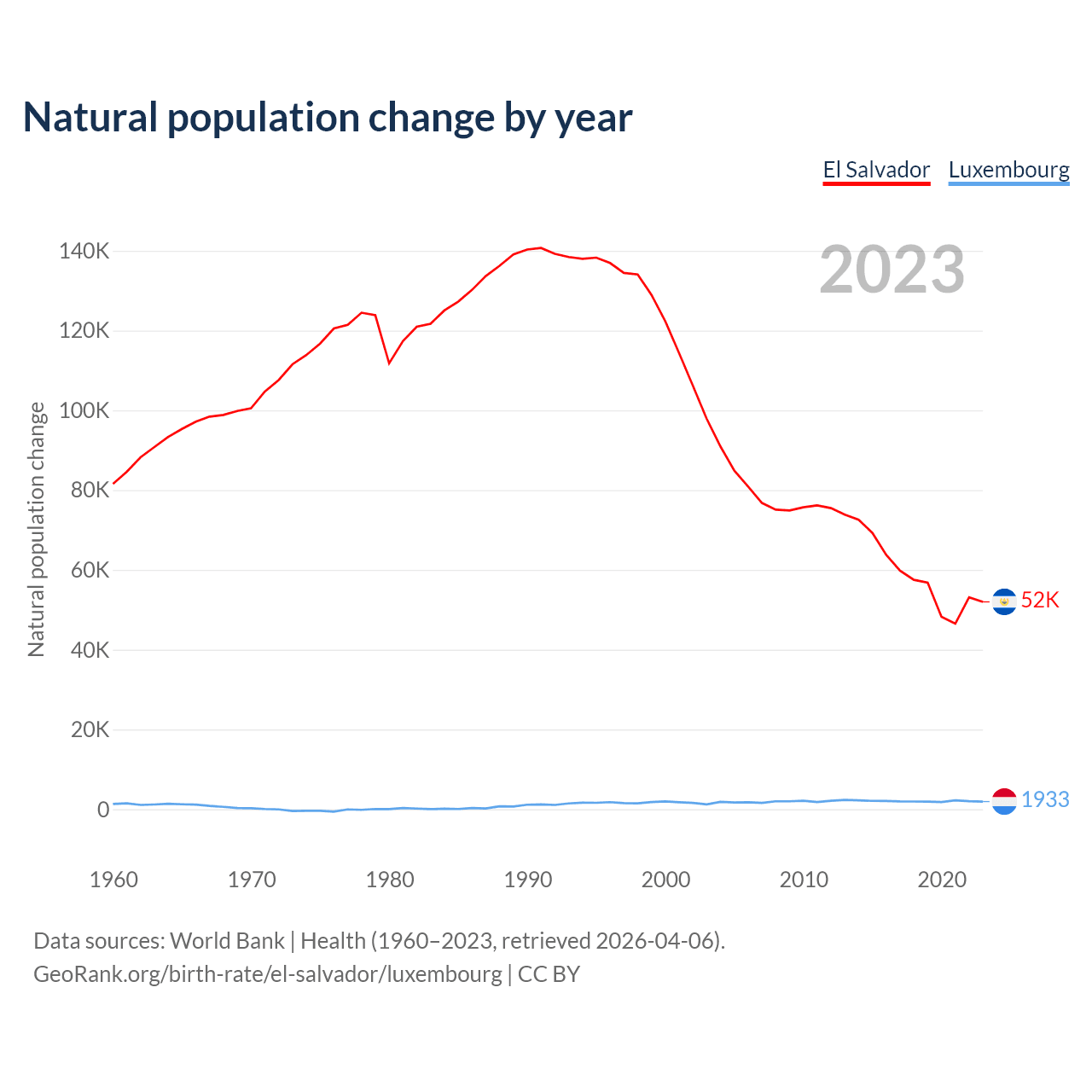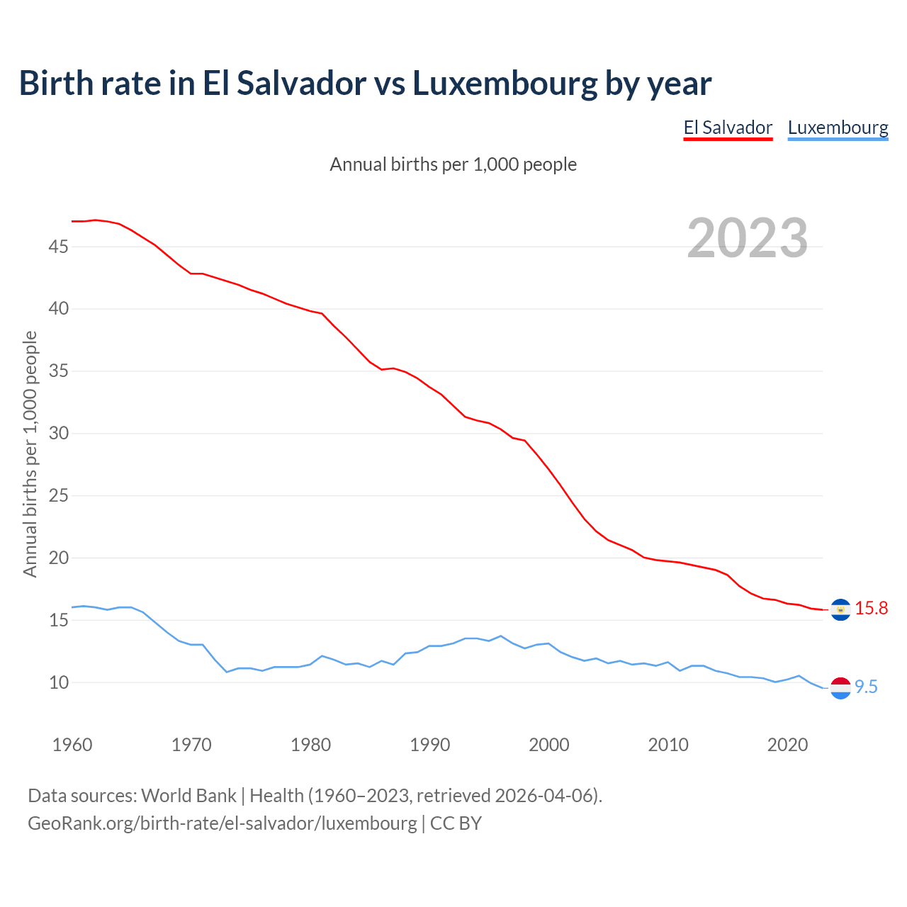 El Salvador has an annual birth rate of 15.8 births per 1,000 people, compared to 9.5 for Luxembourg. The average number of children a woman is expected to have during her lifetime — the fertility rate, is 1.78 in El Salvador and 1.25 in Luxembourg — 29.6% difference.