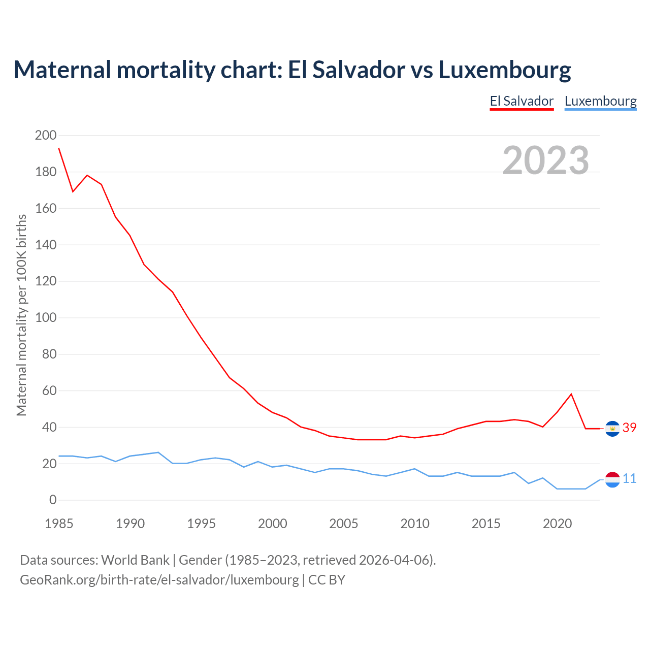 The maternal mortality rate, which is the probability of dying during childbirth or within 42 days of pregnancy termination, is 39 deaths per 100,000 live births in El Salvador, compared to 11 deaths in Luxembourg.
