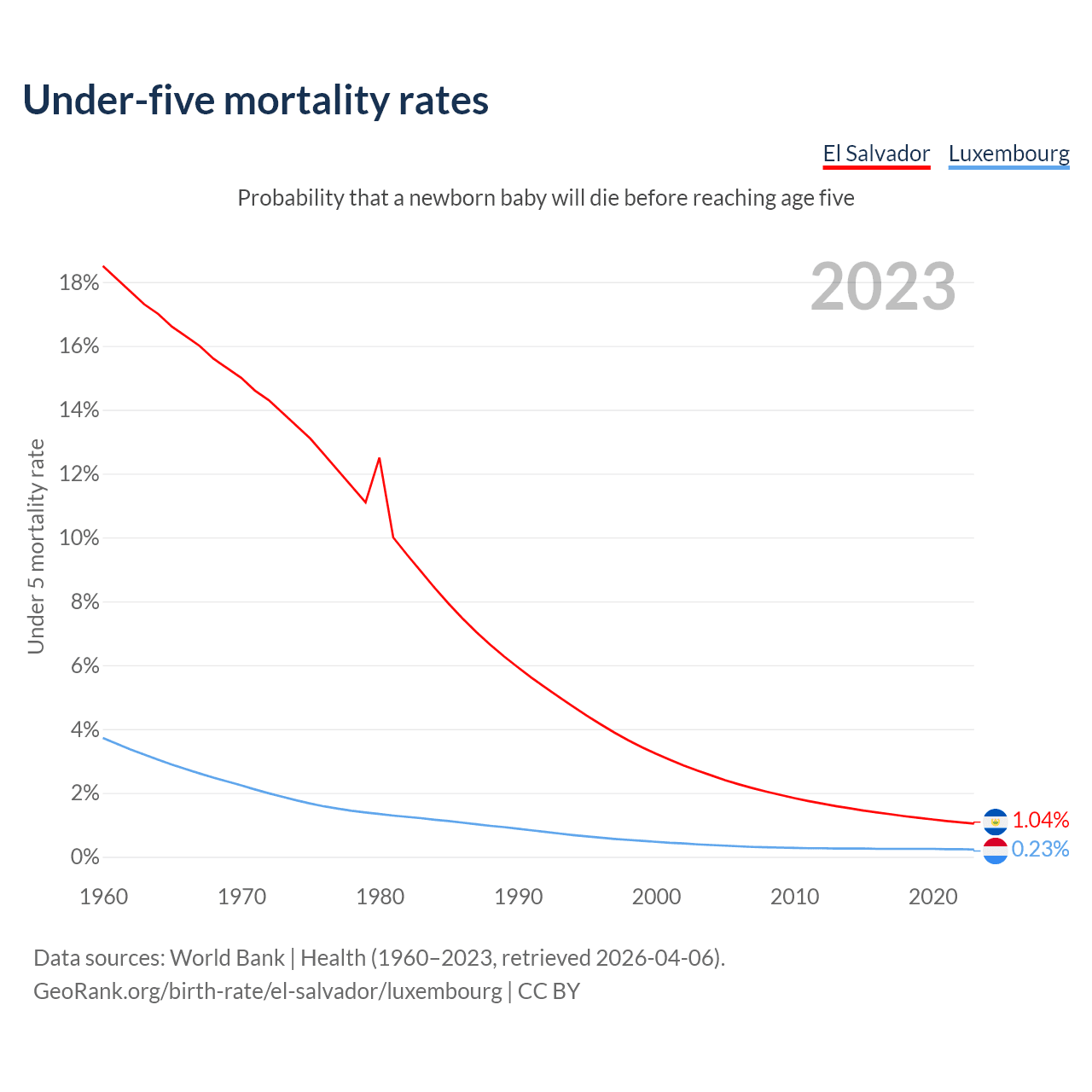 The chance that a newborn baby will die before reaching age five is 1.04% in El Salvador and 0.23% in Luxembourg. Above is a chart with historical data on under-five mortality rates.