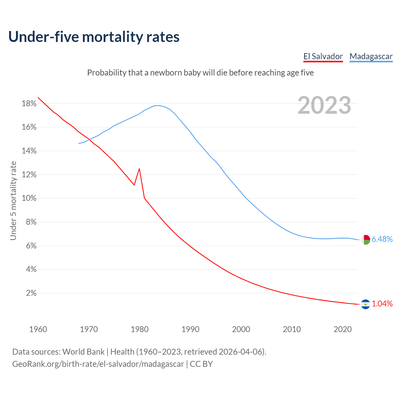 The chance that a newborn baby will die before reaching age five is 1.04% in El Salvador and 6.48% in Madagascar. Above is a chart with historical data on under-five mortality rates.