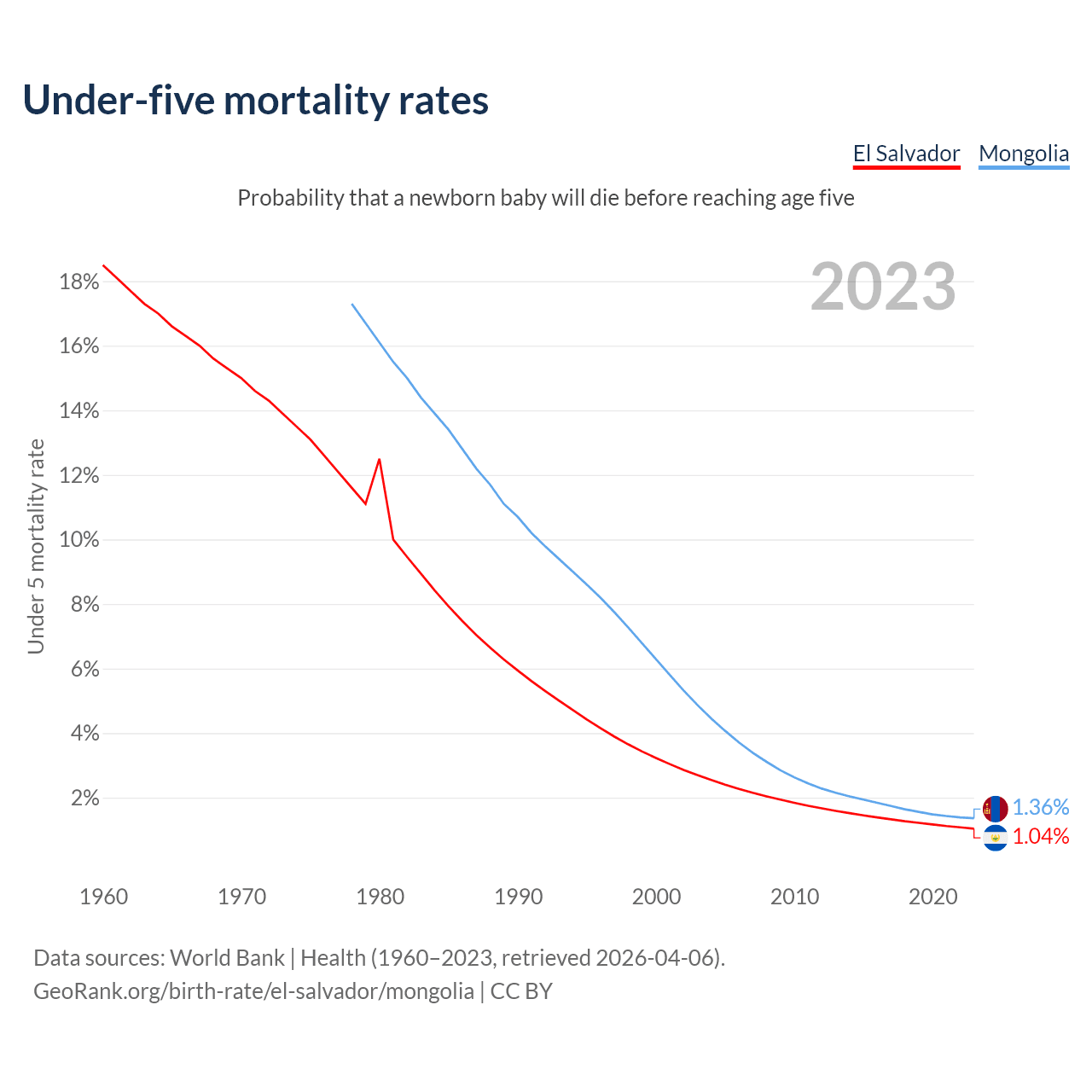 The chance that a newborn baby will die before reaching age five is 1.04% in El Salvador and 1.36% in Mongolia. Above is a chart with historical data on under-five mortality rates.