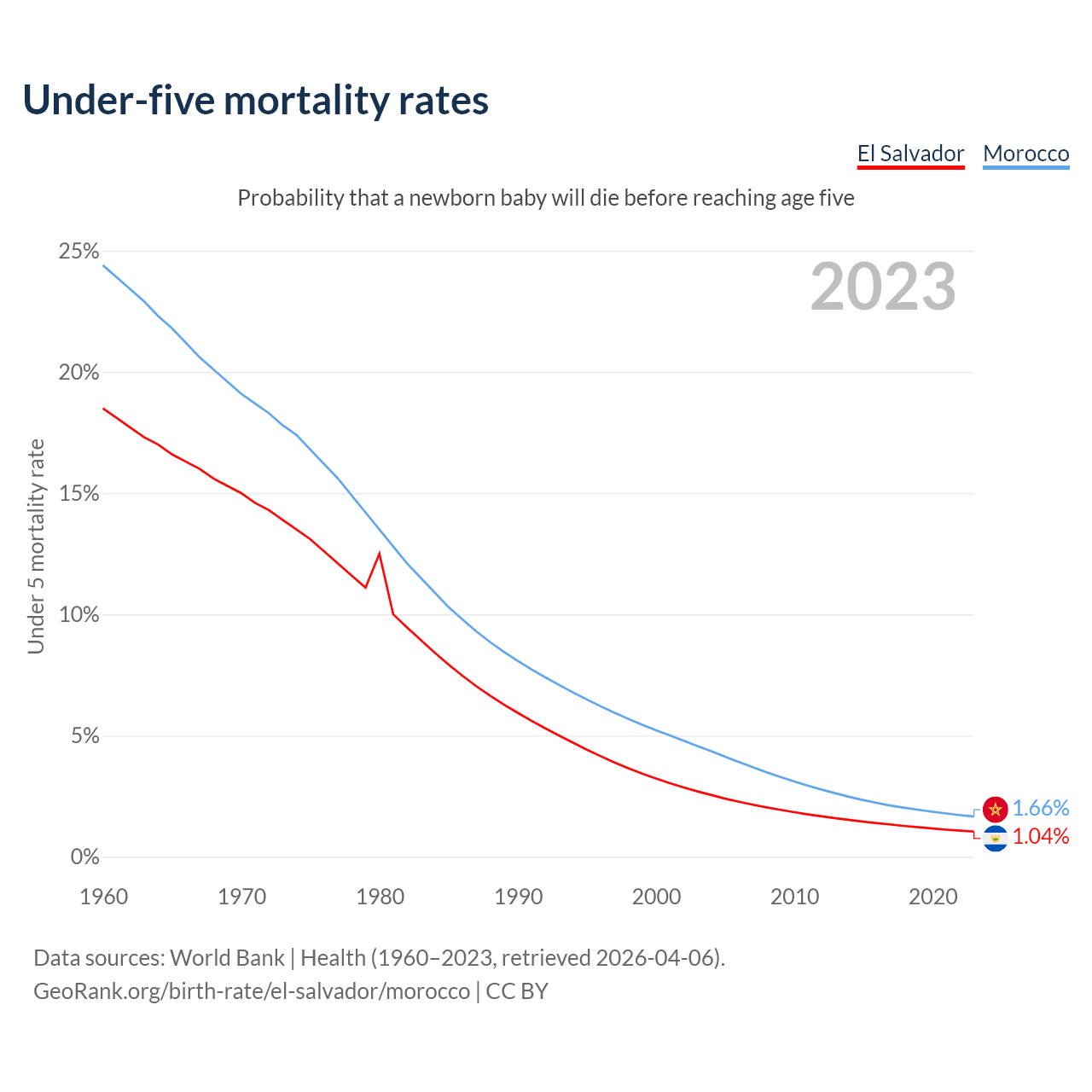 The chance that a newborn baby will die before reaching age five is 1.04% in El Salvador and 1.66% in Morocco. Above is a chart with historical data on under-five mortality rates.