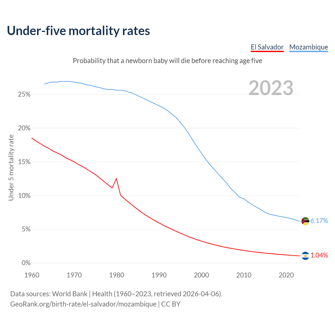 The chance that a newborn baby will die before reaching age five is 1.04% in El Salvador and 6.17% in Mozambique. Above is a chart with historical data on under-five mortality rates.