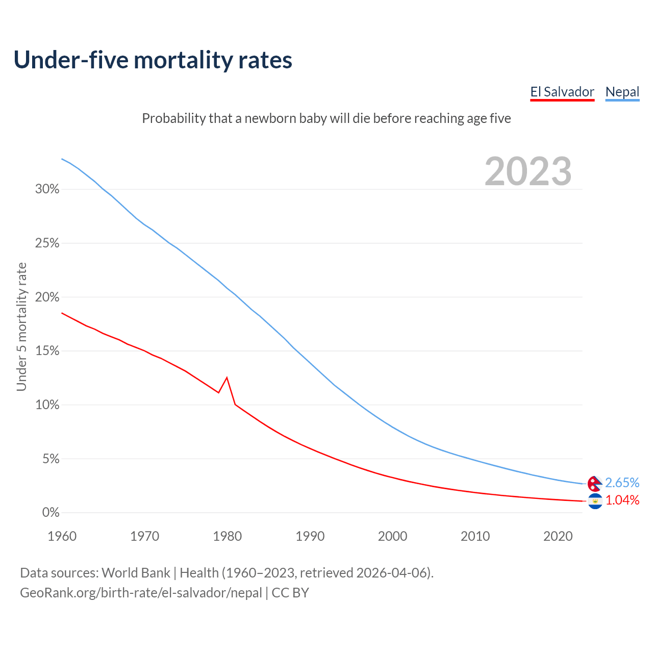 The chance that a newborn baby will die before reaching age five is 1.04% in El Salvador and 2.65% in Nepal. Above is a chart with historical data on under-five mortality rates.