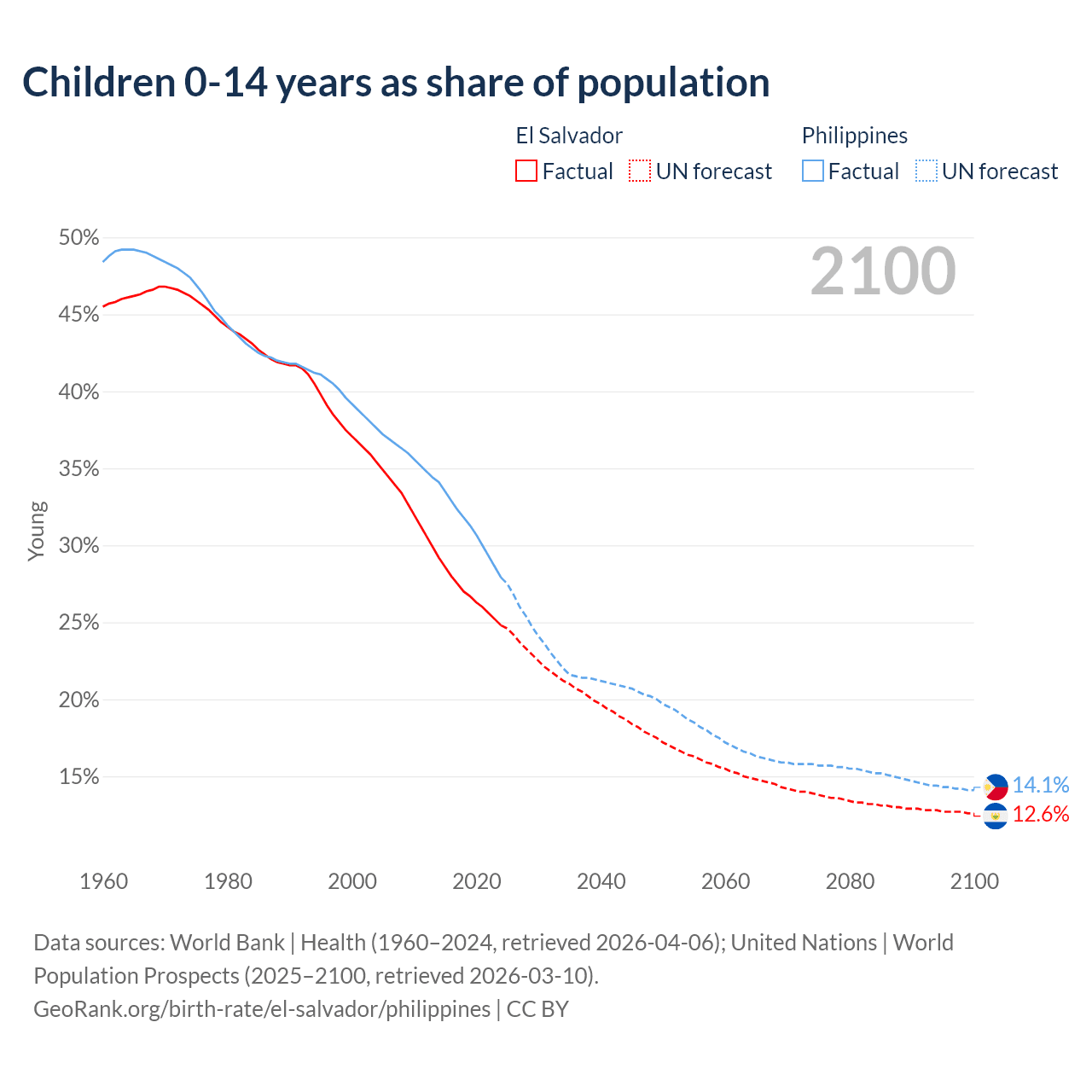 According to the latest available data on birth rates, the fertility rate in El Salvador was 1.78 children per woman in 2023, compared to 1.92 in the Philippines in 2023. The replacement level is considered to be 2.1 children per woman.