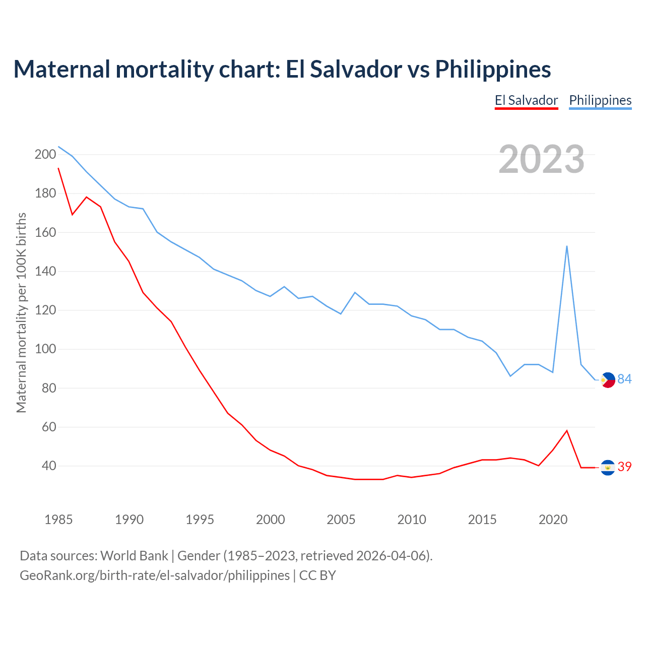 The maternal mortality rate, which is the probability of dying during childbirth or within 42 days of pregnancy termination, is 39 deaths per 100,000 live births in El Salvador, compared to 84 deaths in the Philippines.