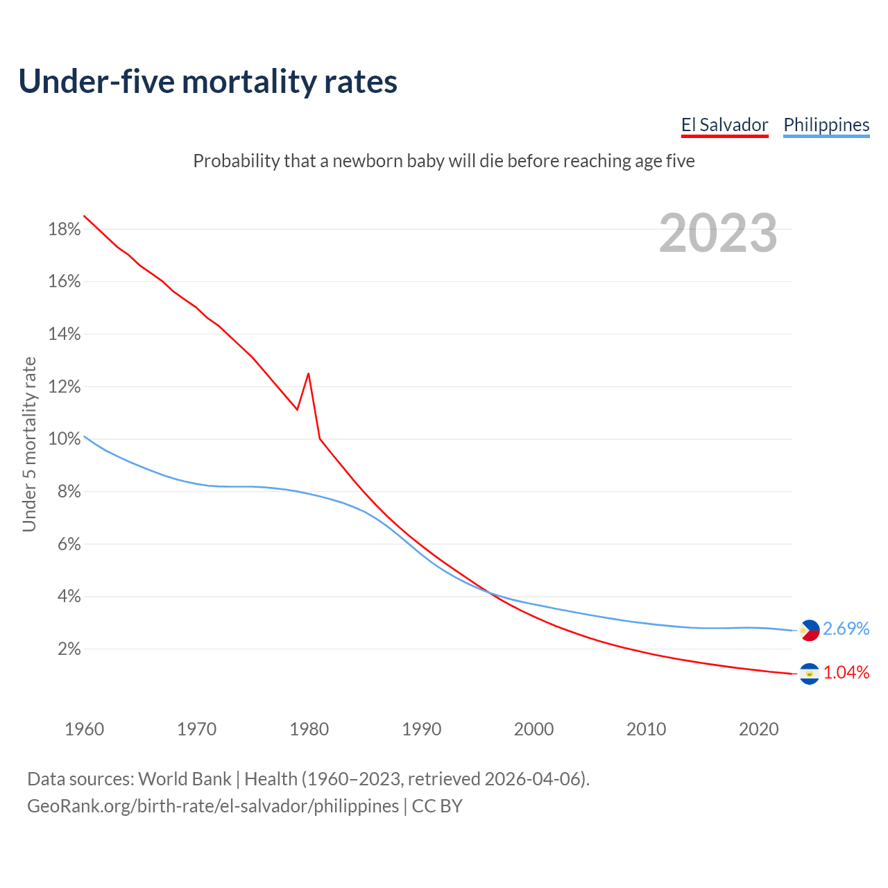The chance that a newborn baby will die before reaching age five is 1.04% in El Salvador and 2.69% in the Philippines. Above is a chart with historical data on under-five mortality rates.