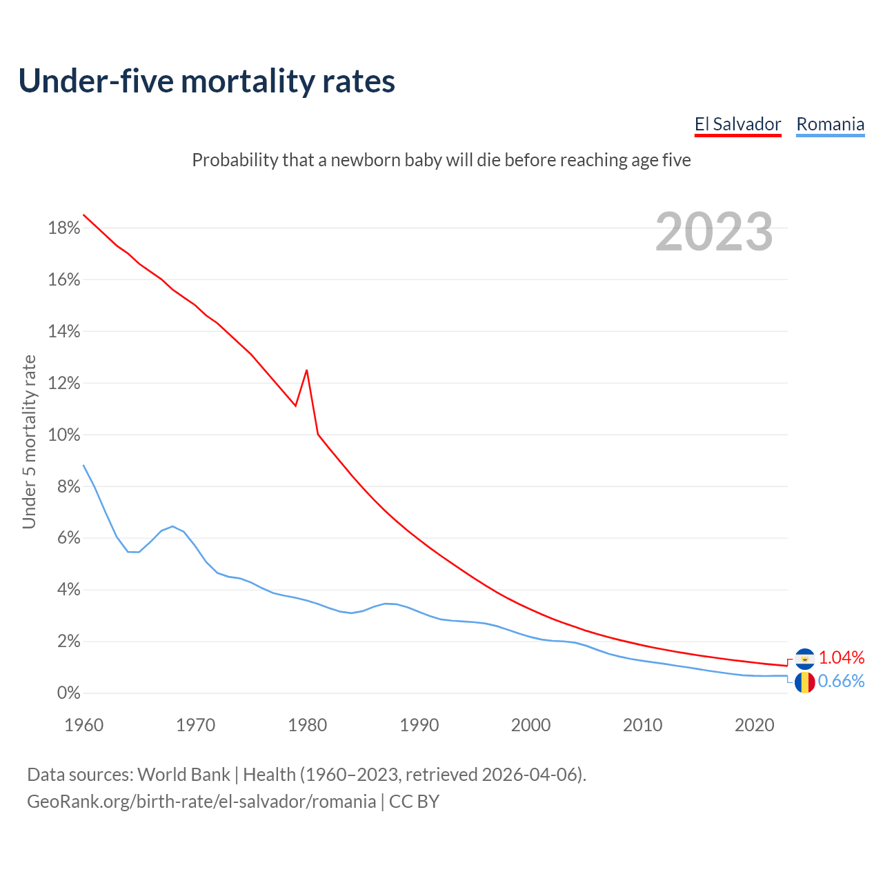 The chance that a newborn baby will die before reaching age five is 1.04% in El Salvador and 0.66% in Romania. Above is a chart with historical data on under-five mortality rates.