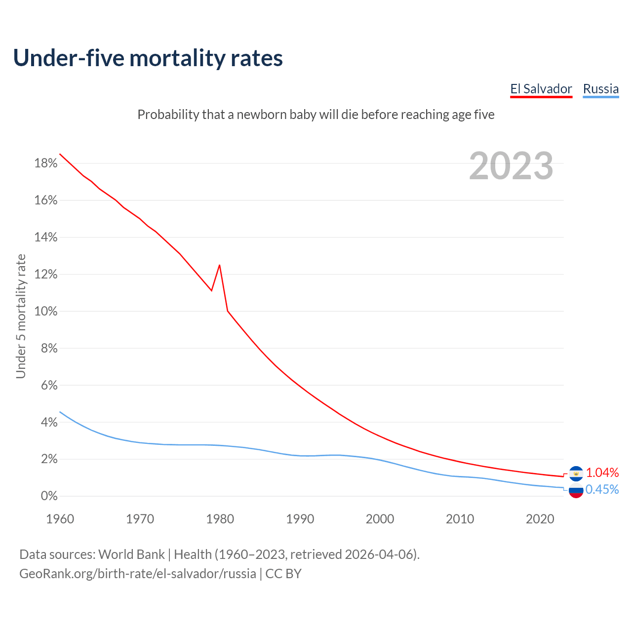 The chance that a newborn baby will die before reaching age five is 1.04% in El Salvador and 0.45% in Russia. Above is a chart with historical data on under-five mortality rates.
