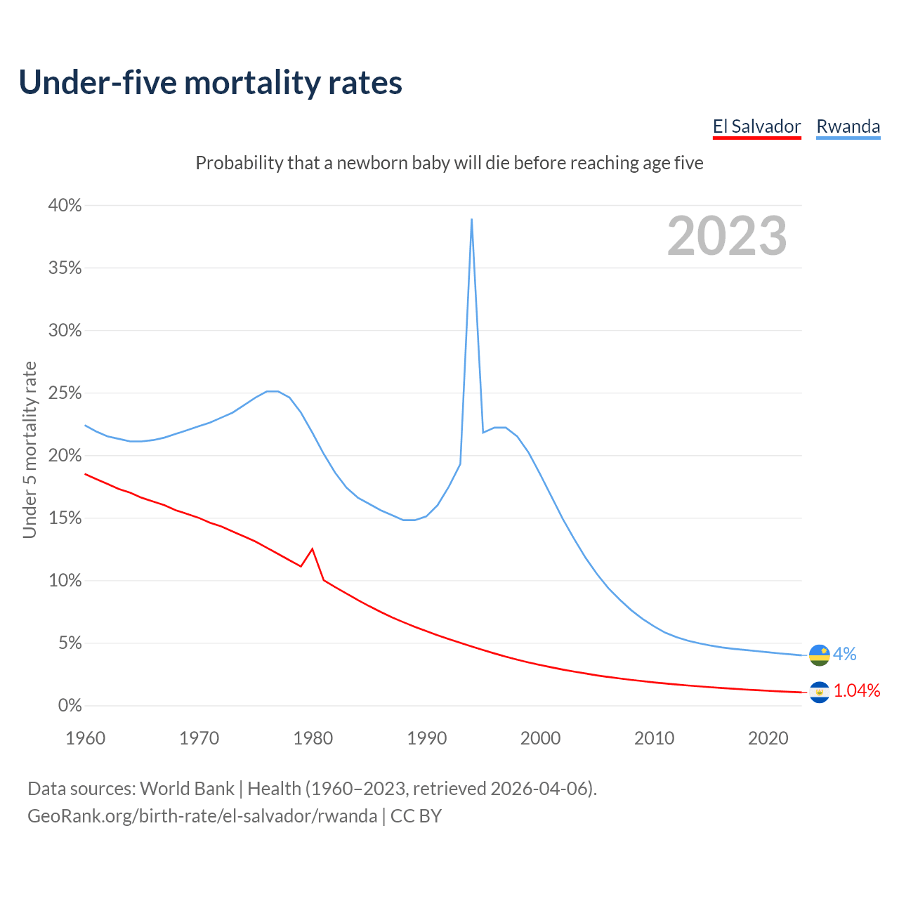 The chance that a newborn baby will die before reaching age five is 1.04% in El Salvador and 4% in Rwanda. Above is a chart with historical data on under-five mortality rates.