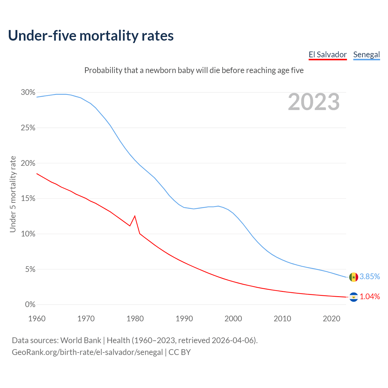 The chance that a newborn baby will die before reaching age five is 1.04% in El Salvador and 3.85% in Senegal. Above is a chart with historical data on under-five mortality rates.