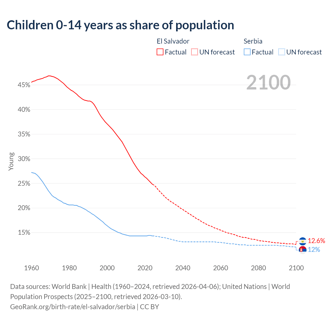 According to the latest available data on birth rates, the fertility rate in El Salvador was 1.78 children per woman in 2023, compared to 1.61 in Serbia in 2023. The replacement level is considered to be 2.1 children per woman.
