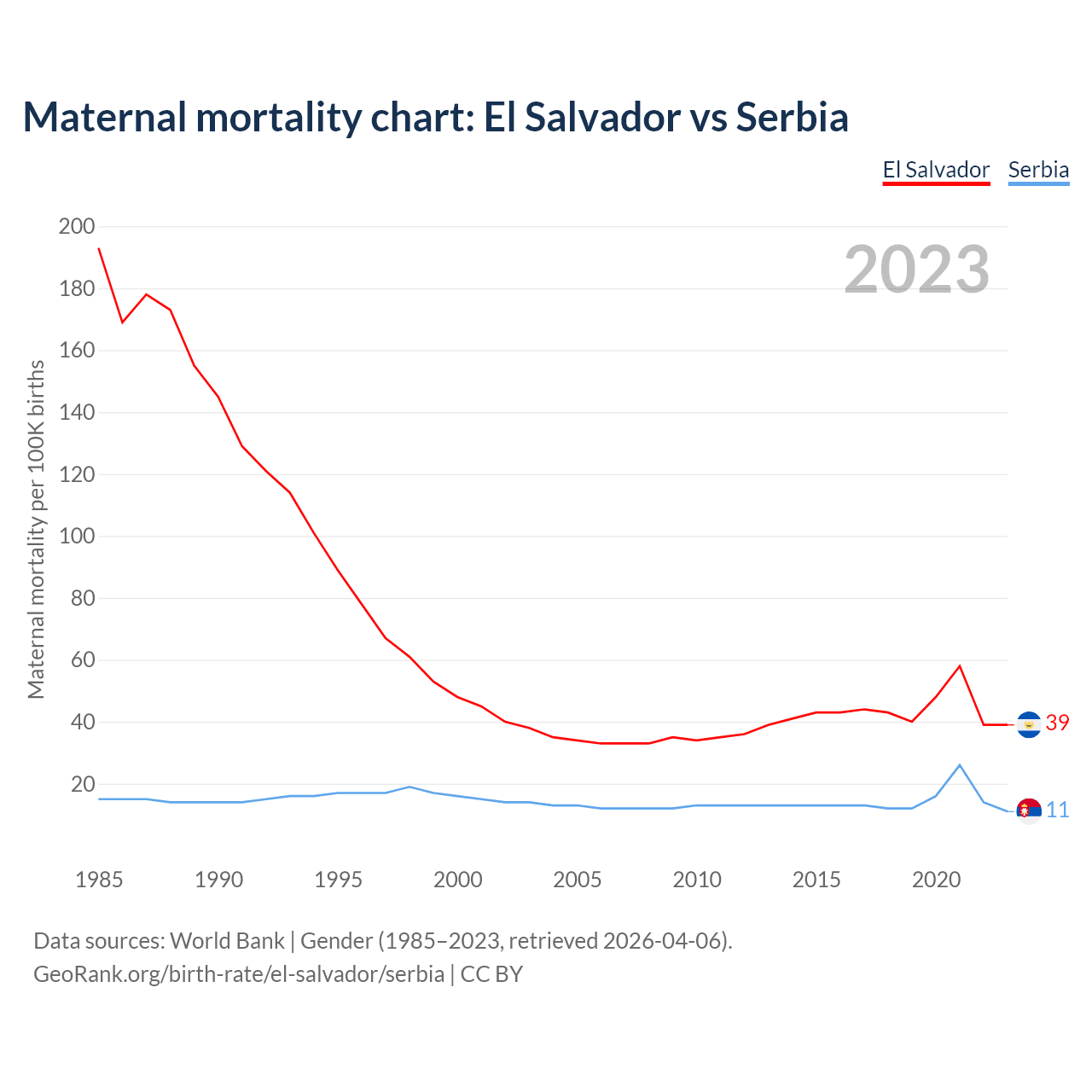 The maternal mortality rate, which is the probability of dying during childbirth or within 42 days of pregnancy termination, is 39 deaths per 100,000 live births in El Salvador, compared to 11 deaths in Serbia.