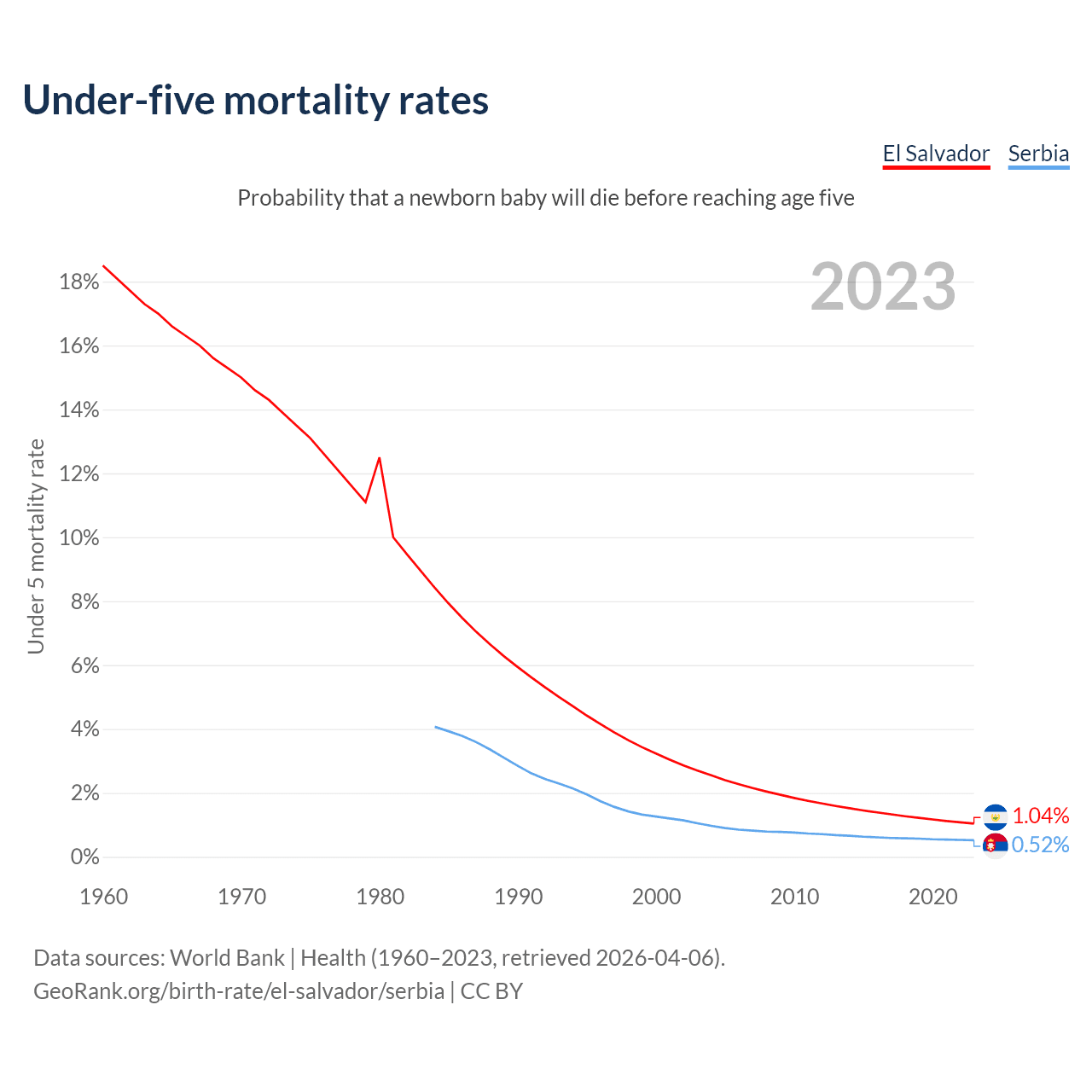 The chance that a newborn baby will die before reaching age five is 1.04% in El Salvador and 0.52% in Serbia. Above is a chart with historical data on under-five mortality rates.