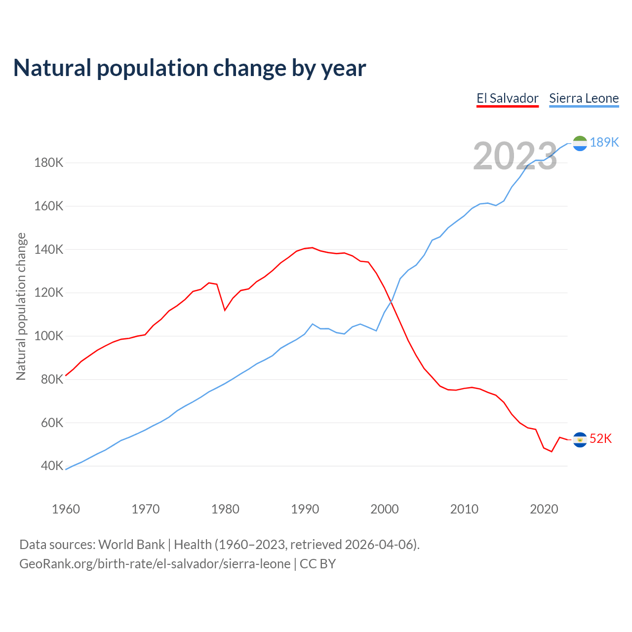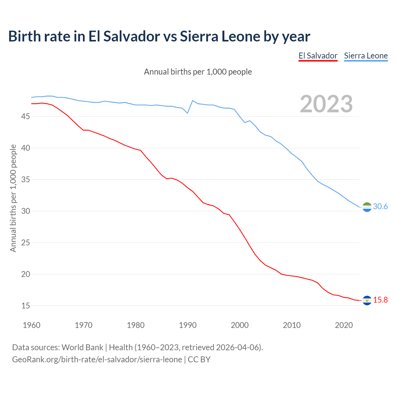 El Salvador has an annual birth rate of 15.8 births per 1,000 people, compared to 30.6 for Sierra Leone. The average number of children a woman is expected to have during her lifetime — the fertility rate, is 1.78 in El Salvador and 3.79 in Sierra Leone — 113.6% difference.