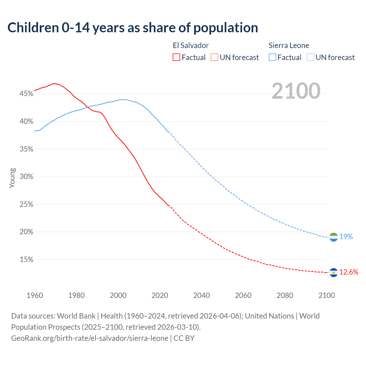 According to the latest available data on birth rates, the fertility rate in El Salvador was 1.78 children per woman in 2023, compared to 3.79 in Sierra Leone in 2023. The replacement level is considered to be 2.1 children per woman.
