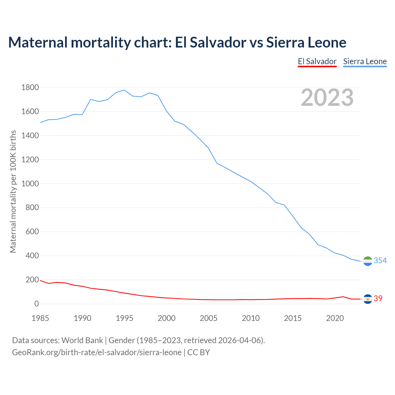 The maternal mortality rate, which is the probability of dying during childbirth or within 42 days of pregnancy termination, is 39 deaths per 100,000 live births in El Salvador, compared to 354 deaths in Sierra Leone.