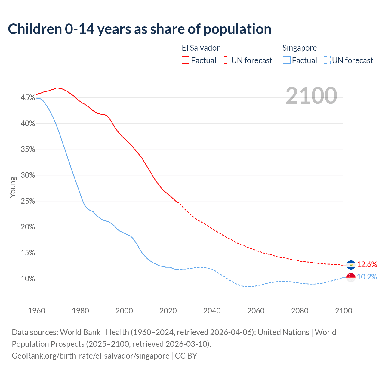 According to the latest available data on birth rates, the fertility rate in El Salvador was 1.78 children per woman in 2023, compared to 0.97 in Singapore in 2023. The replacement level is considered to be 2.1 children per woman.