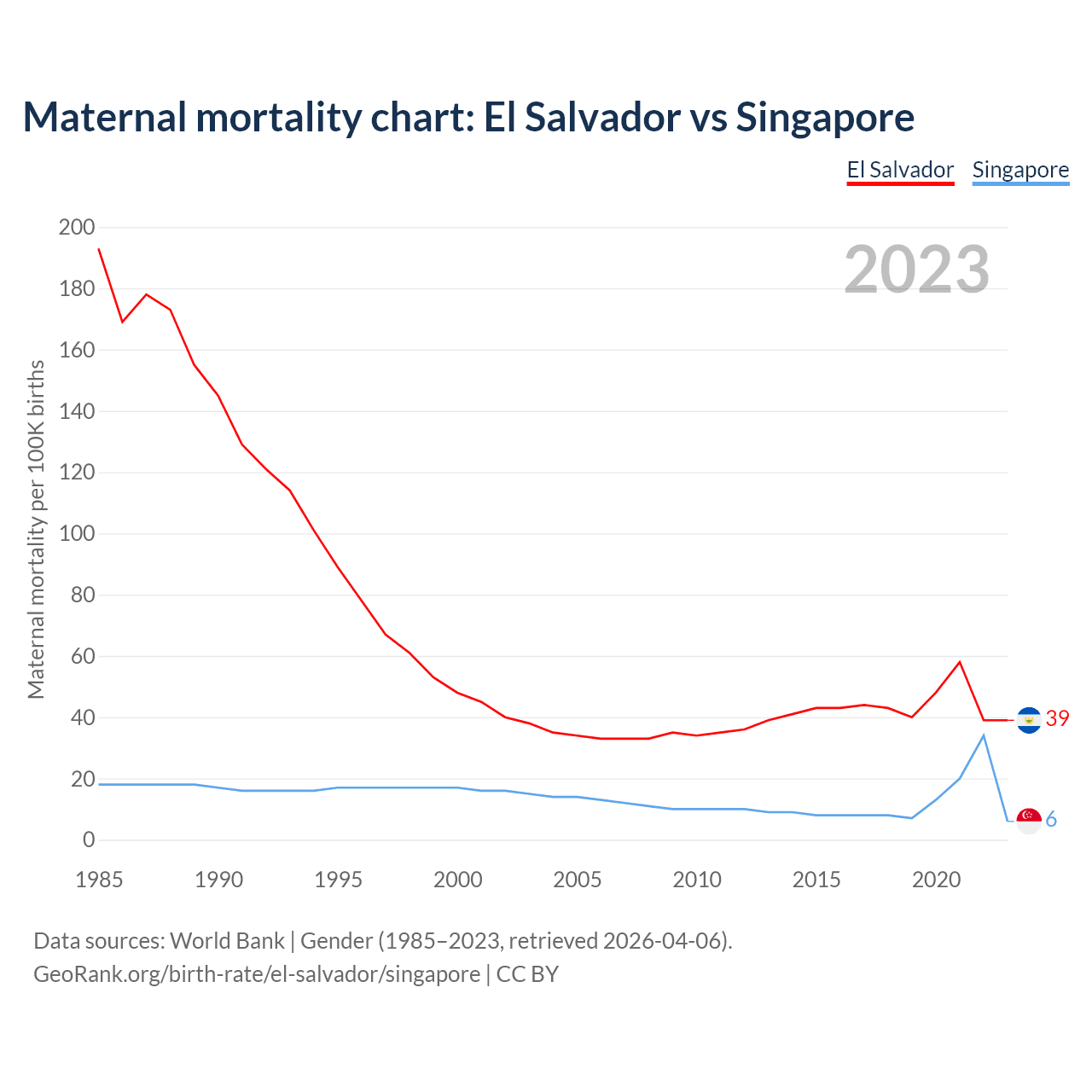 The maternal mortality rate, which is the probability of dying during childbirth or within 42 days of pregnancy termination, is 39 deaths per 100,000 live births in El Salvador, compared to 6 deaths in Singapore.