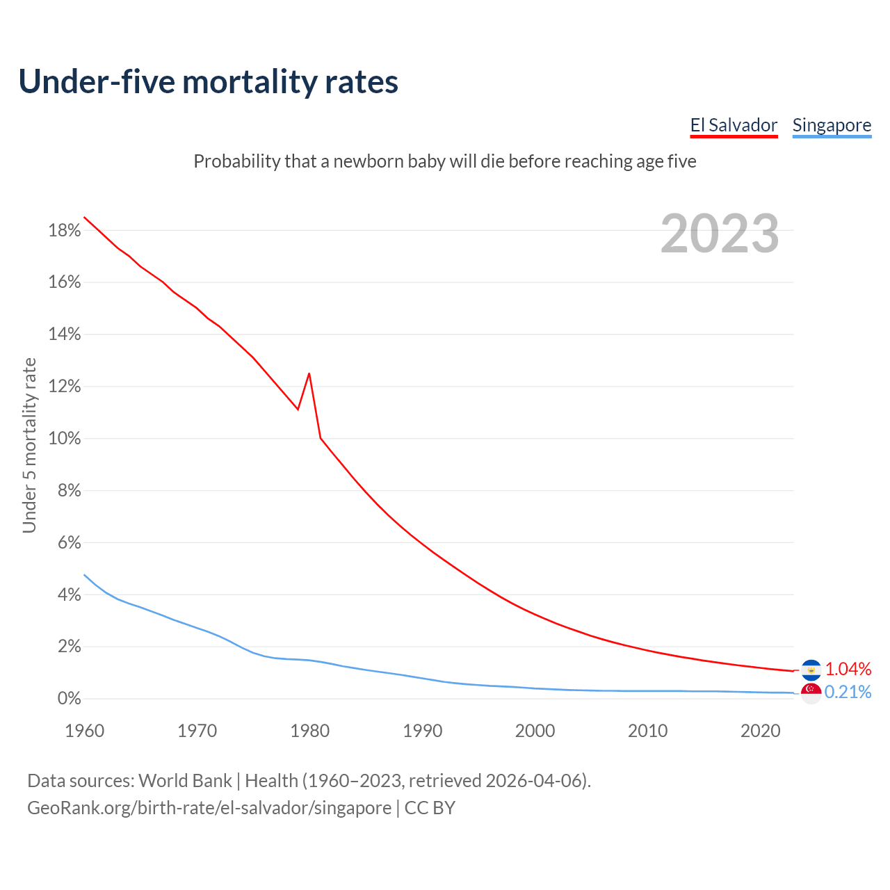 The chance that a newborn baby will die before reaching age five is 1.04% in El Salvador and 0.21% in Singapore. Above is a chart with historical data on under-five mortality rates.