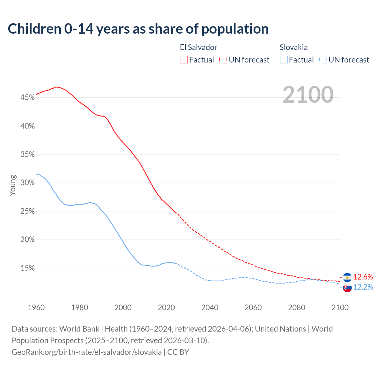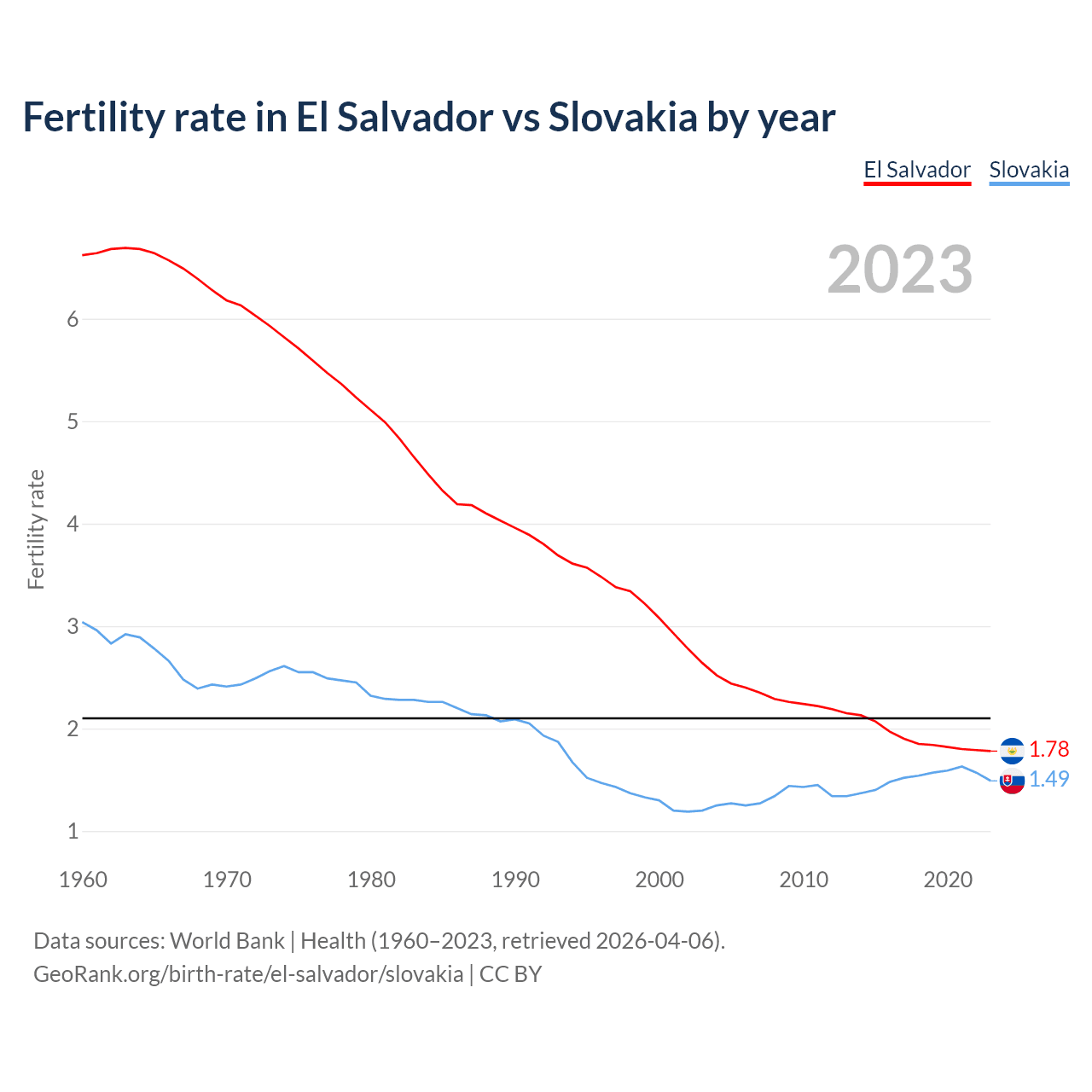 According to the latest available data on birth rates, the fertility rate in El Salvador was 1.78 children per woman in 2023, compared to 1.49 in Slovakia in 2023. The replacement level is considered to be 2.1 children per woman.