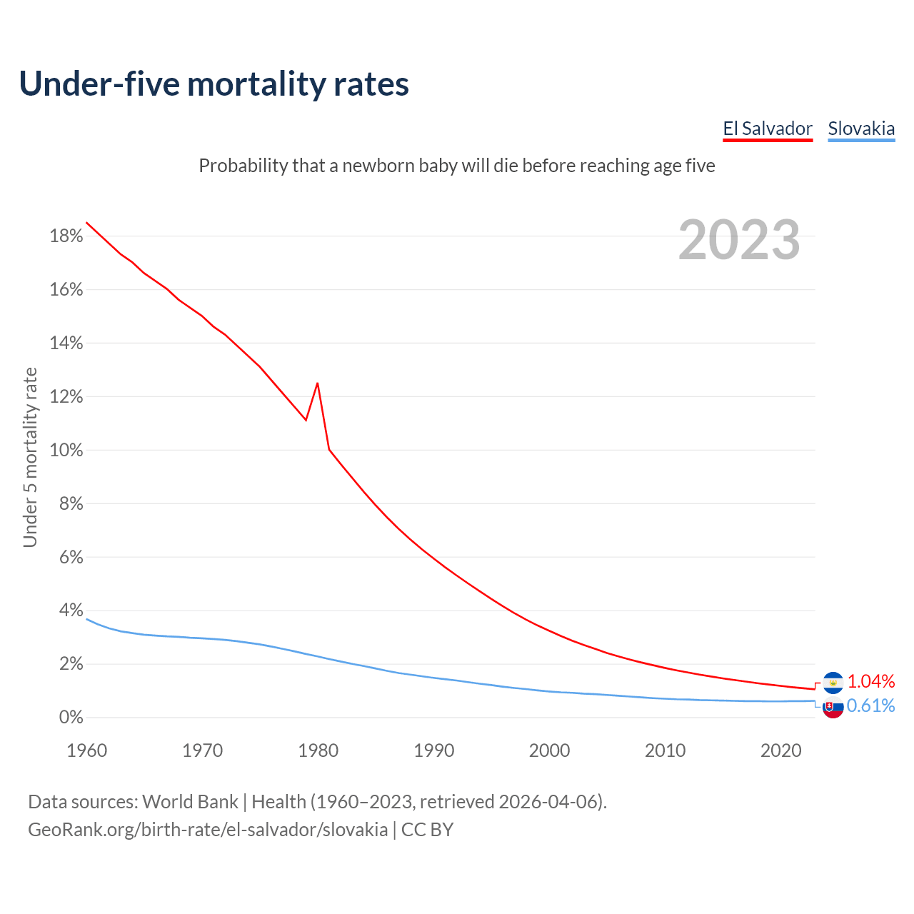 The chance that a newborn baby will die before reaching age five is 1.04% in El Salvador and 0.61% in Slovakia. Above is a chart with historical data on under-five mortality rates.