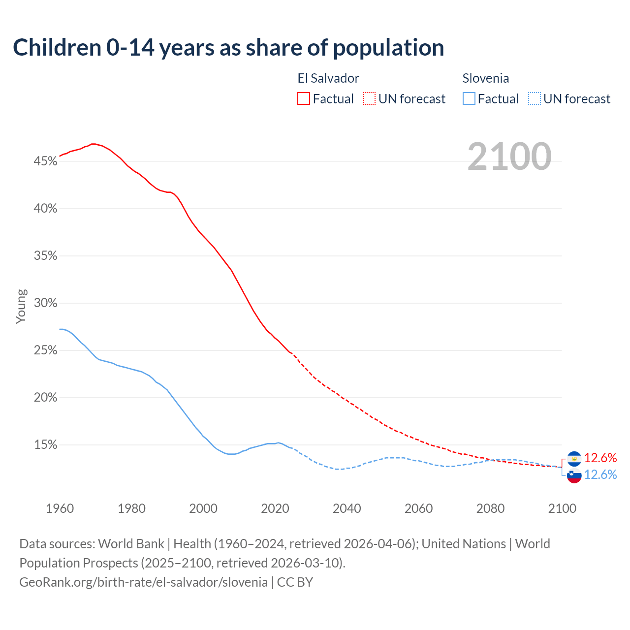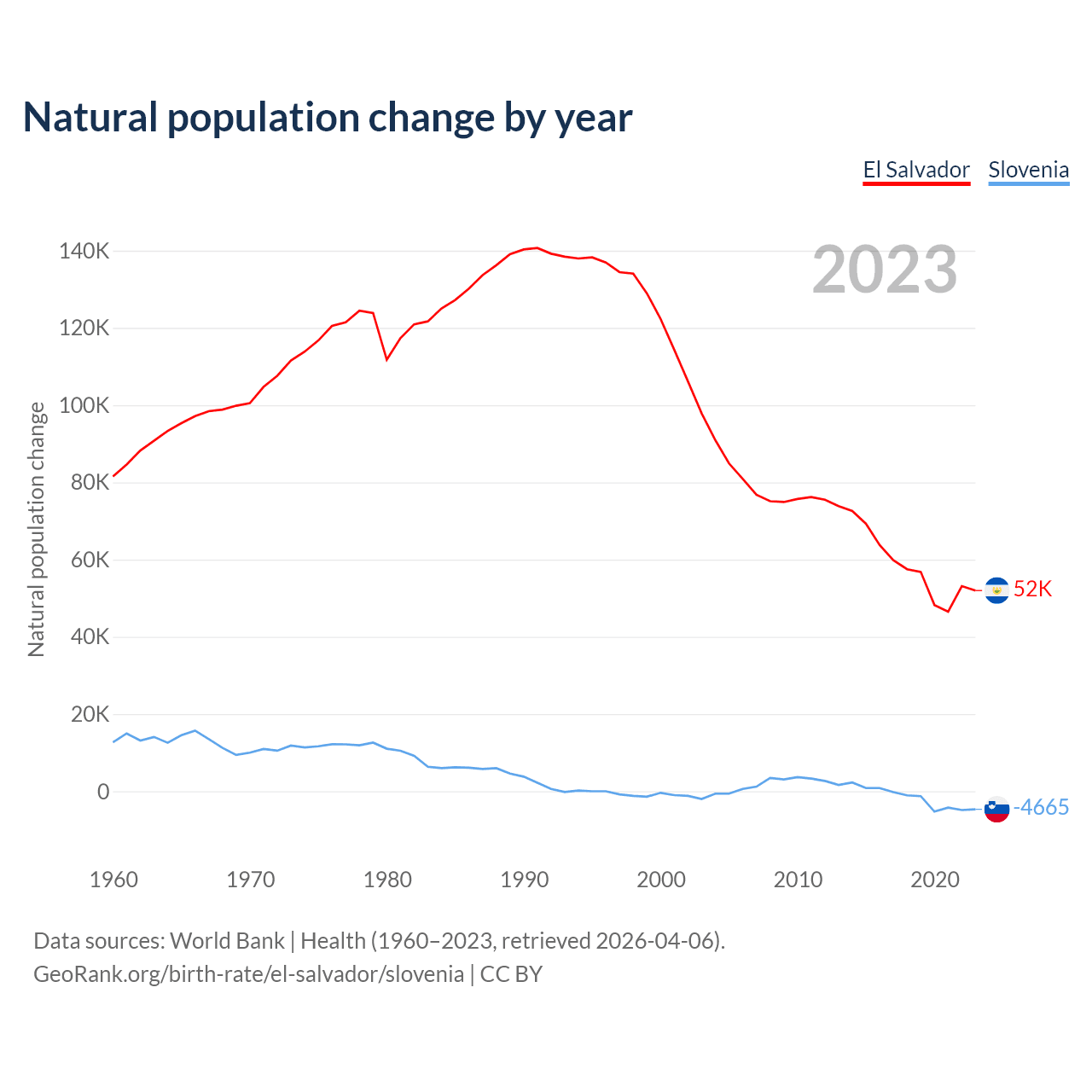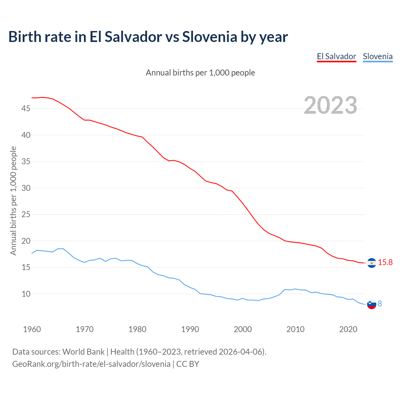 El Salvador has an annual birth rate of 15.8 births per 1,000 people, compared to 8 for Slovenia. The average number of children a woman is expected to have during her lifetime — the fertility rate, is 1.78 in El Salvador and 1.51 in Slovenia — 14.9% difference.