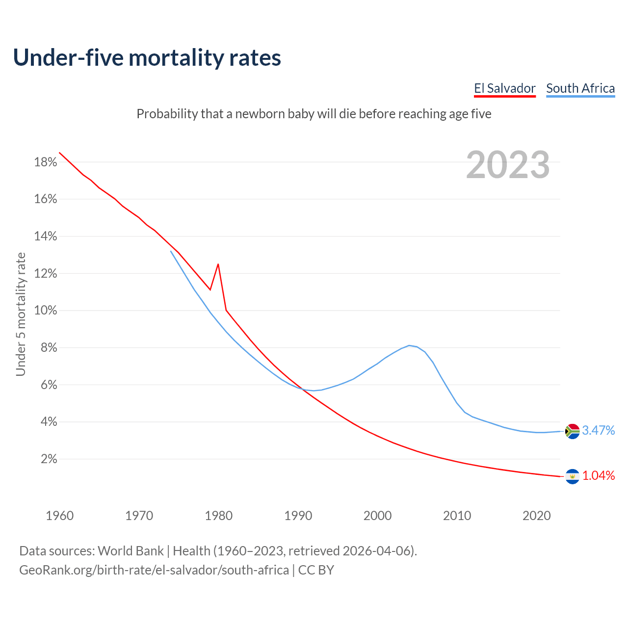 The chance that a newborn baby will die before reaching age five is 1.04% in El Salvador and 3.47% in South Africa. Above is a chart with historical data on under-five mortality rates.