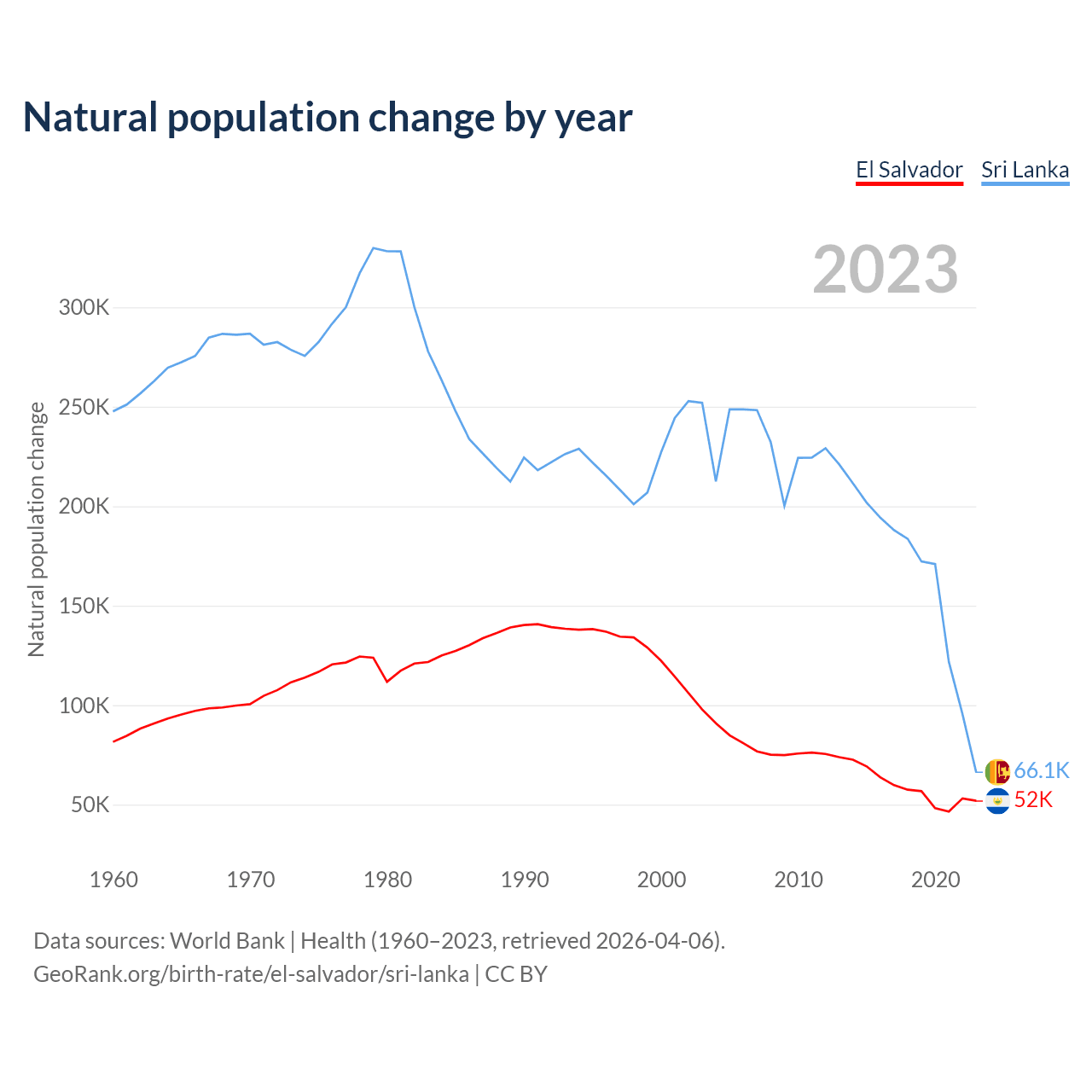 According to the latest available data on birth rates, the fertility rate in El Salvador was 1.78 children per woman in 2023, compared to 1.97 in Sri Lanka in 2023. The replacement level is considered to be 2.1 children per woman.
